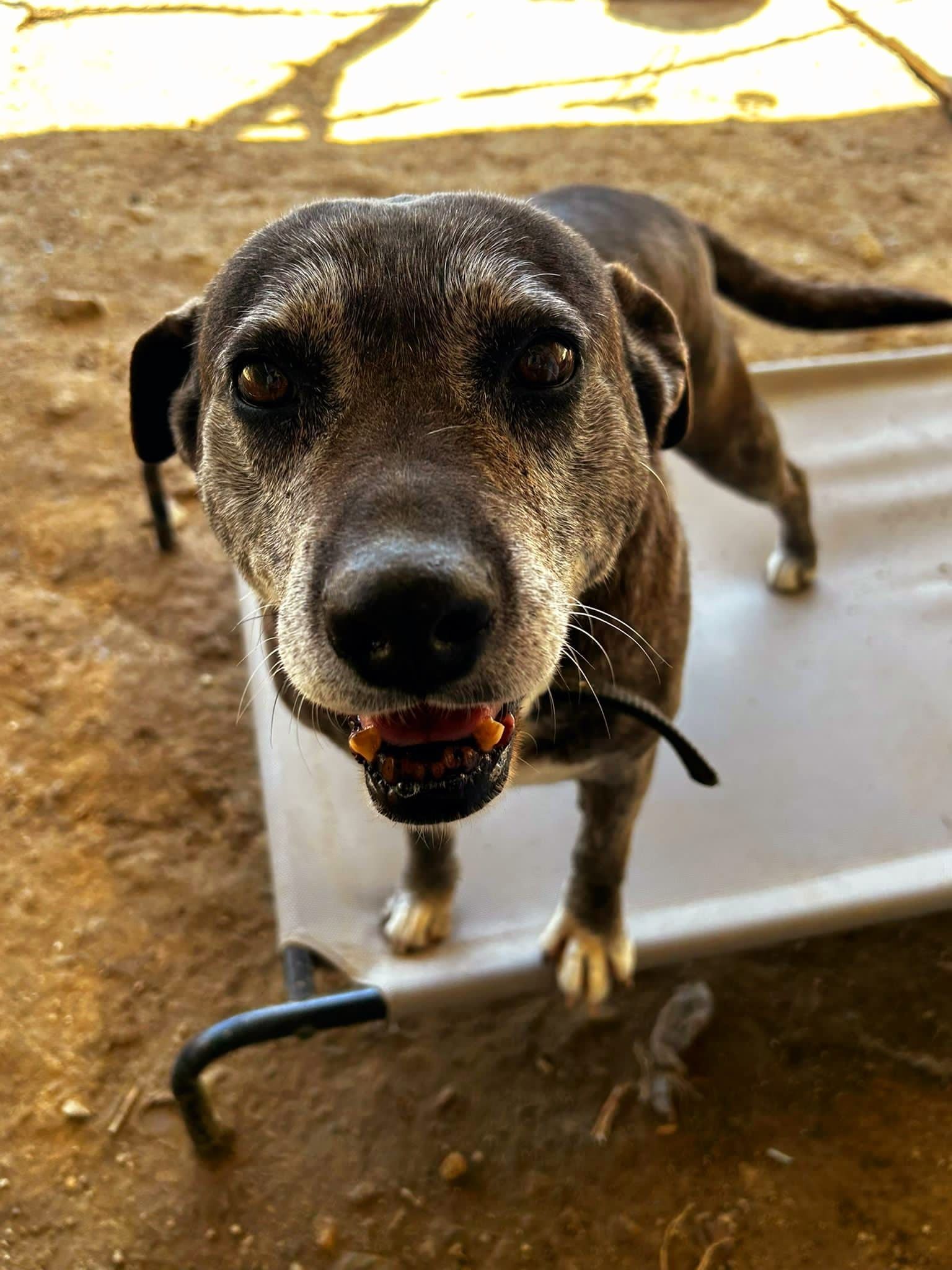 „Hallo ihr lieben Menschen, ich bin Samira! 🐕🦺 Ich bin erst seit kurzem hier im Shelter in Mirtofito, endlich weg von der Kette, an der ich nun jahrelang am Haus gelebt habe, ob das sechs oder acht Jahre waren, ich weiß es nicht genau. Ich habe aktuell hier noch ein Gehege für mich ganz alleine, was auch gut so ist, weil ich all die anderen Hunde nicht einschätzen kann und alle wegknurre oder -beiße, denn bisher hab ich nur schlechte Erfahrungen gemacht, konnte mich ja an der Kette fixiert nicht wehren. Mit allen Menschen hier komme ich gut aus, die kann ich ganz gut einschätzen, die wollen mich füttern und verwöhnen. Solche Streicheleinheiten genieße ich, aber das ein oder andere Extra wäre auch schön. Ich hätte zum Beispiel gern so ein Hochbett wie im Nachbargehege, und die Menschen haben mir versprochen, dass ich von der nächsten Spende auch was bekomme. Danke dafür!! 🙏🏽“