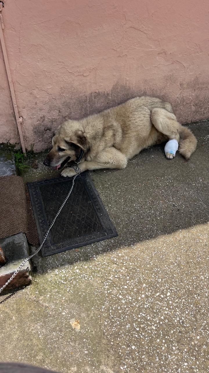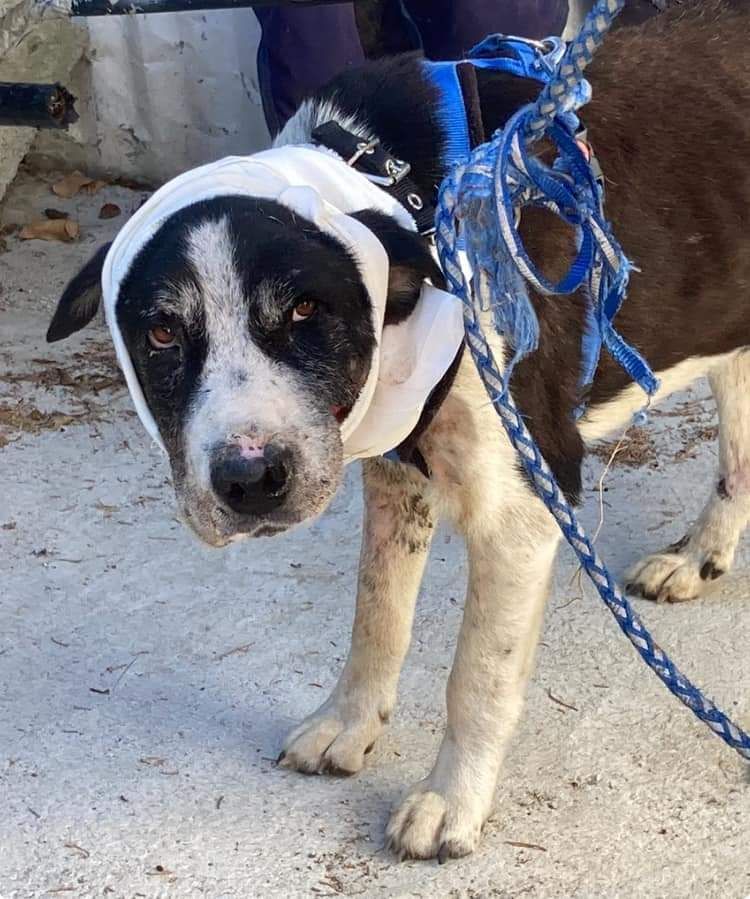 Dieser arme Kerl lebte in Folia auf der Straße. Was passiert ist, können wir nur ahnen, vermutlich ein Autounfall, Gott sei Dank hat eine griechische Familie sich erbarmt und Nikao zu sich in den Garten geholt, uns allerdings um Hilfe gebeten, da diese Familie sehr arm ist und die Tierarztkosten nicht tragen kann. Nun hat unsere Tierschützerin Aliki sich erst einmal um Nikao gekümmert, hat dafür gesorgt, dass er geimpft wurde, fährt regelmäßig hin, um die Wunden und das Fell, welches voller Parasiten war, sauber zu halten, die betroffene Pfote neu zu verbinden. Bis Nikao ganz gesund ist, lassen wir ihn als Pflegehund, würden uns aber über Paten freuen, die uns helfen, die Tierarzt-Kosten für diesen Hund zu schultern. Nikao ist wirklich sehr tapfer und lässt die Behandlung täglich über sich ergehen, ein ganz sanftmütigen Bursche.