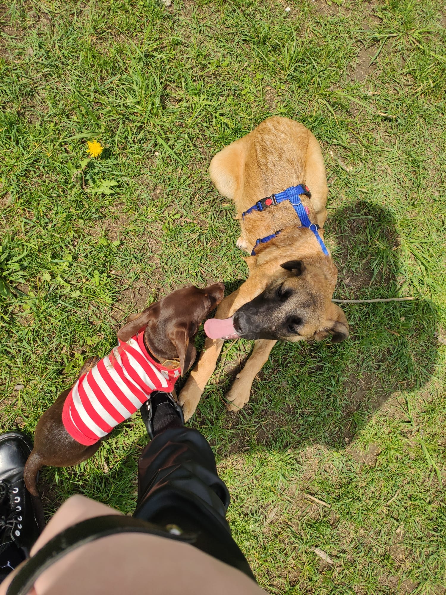 Paul vormals Ruby kam schon ziemlich aufgeschlossen und ziemlich verschmust bei uns an. Der erste Kontakt mit unserer Hündin Phina (10 Jahre) fand außerhalb unseres Grundstückes statt. Paul zeigte sich ihr gegenüber freudig, aber sehr respektvoll. Phina schaute sich kurz an mit wem sie es zu tun hatte, ging aber etwas auf Distanz- was Paul sofort akzeptierte. Paul hat wenig Interesse am Spiel mit ihr und geht nur kurzfristig auf Spielaufforderungen ihrerseits ein. Sie leben zusammen wie ein "altes Ehepaar" 😅
