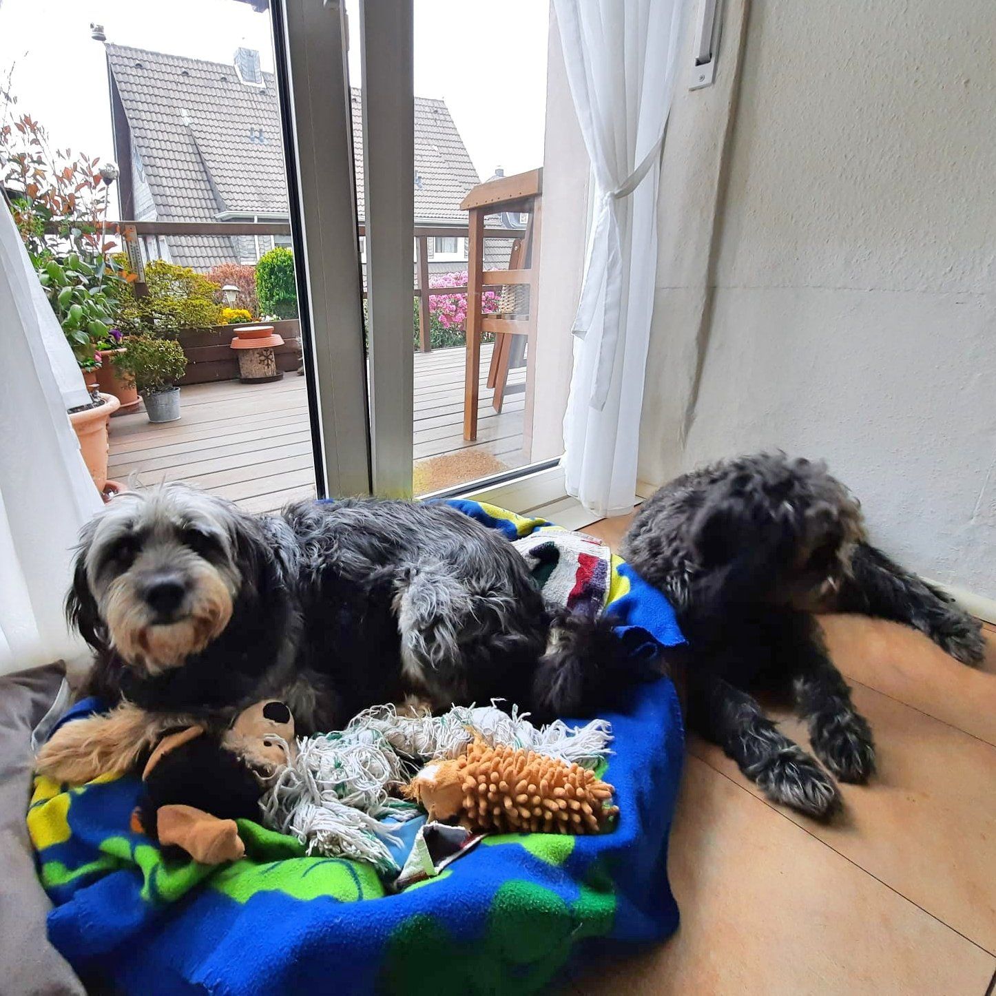 Zuhause hat er ganztägig Zugang zum Haus und dem Grundstück. Er darf sich aufhalten wo er gern mag. Liegeplätze sind im Haus, Garten und der Terrasse ausreichend vorhanden. Er hat zusätzlich einen eigenen Liegeplatz auf den Phina nicht darf und somit auch die Möglichkeit sich komplett in Ruhe hinzulegen.