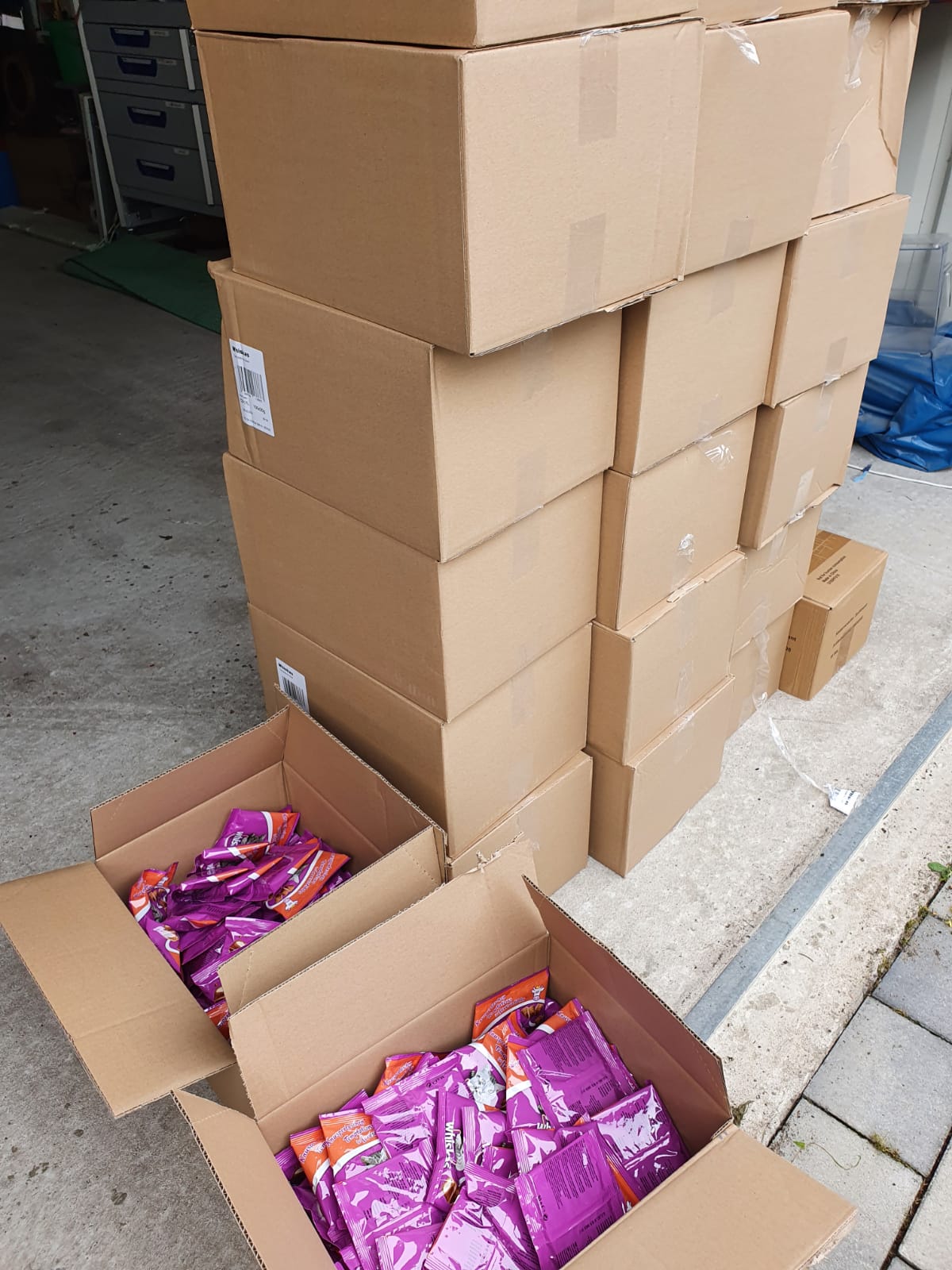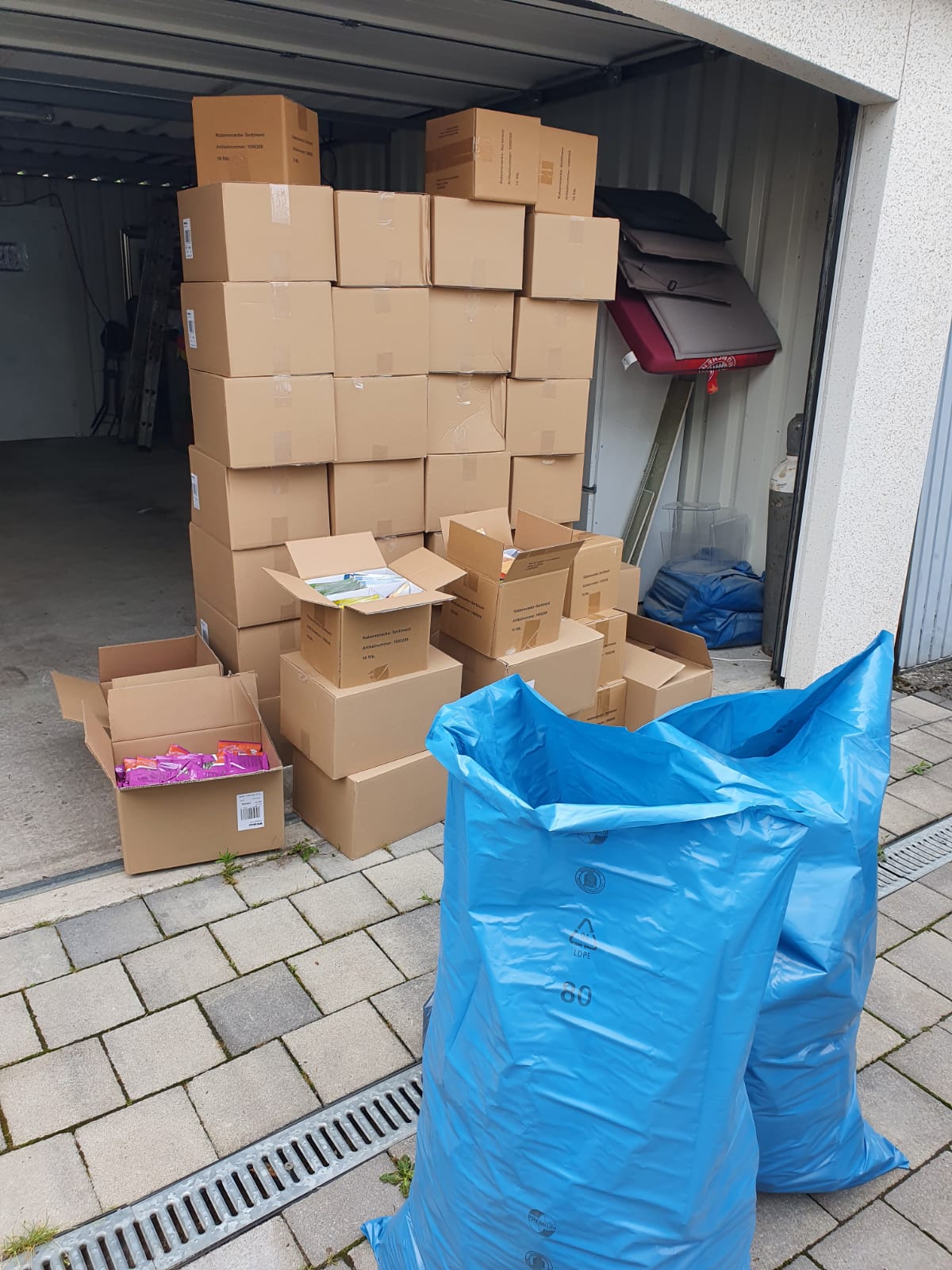 Durch großzügige Geldspenden konnte Aliki bereits das benötigte Desinfektionsmittel sowie weiteres Futter für unsere lieben Hunde ordern. Gestern ist alles angekommen - Aliki hat alle Hände voll zu tun, um alles auszupacken und zu stapeln. Aber sie hat noch ein kleines Zeitfenster finden können, um Euch ein paar Dankesworte zu schreiben: Ihr lieben Menschen, von ganzem Herzen möchte ich euch danken für euere großzügigen Spenden. Wir sind überwältigt für so viel Engagement. Gerade jetzt bevor es immer kälter wird, benötigen wir natürlich auch mehr Futter für die Tiere. Auch für die Tiere, die noch auf der Straße leben. Wir hoffen weiterhin, dass wir eine Möglichkeit finden, bald ein anderes Anwesen für die vielen Hunde, und es werden nicht weniger zu finden. Das ist in Griechenland leider nicht so einfach und es soll auch etwas sein, was wir für einen längeren Zeitraum zur Verfügung haben können. Ihr Lieben, ich bin guter Dinger und mache weiter, damit es den Hunden hier in unserem Umfeld einfach etwas besser gehen kann. Manche haben das enorme Glück, eine liebe Familie für sich zu finden, manche Hunde bleiben aber auch hier und können ihr Leben bei guter Versorgung genießen. Alles ist besser, als auf der Straße leben zu müssen. Ich danke euch zutiefst - eure Aliki