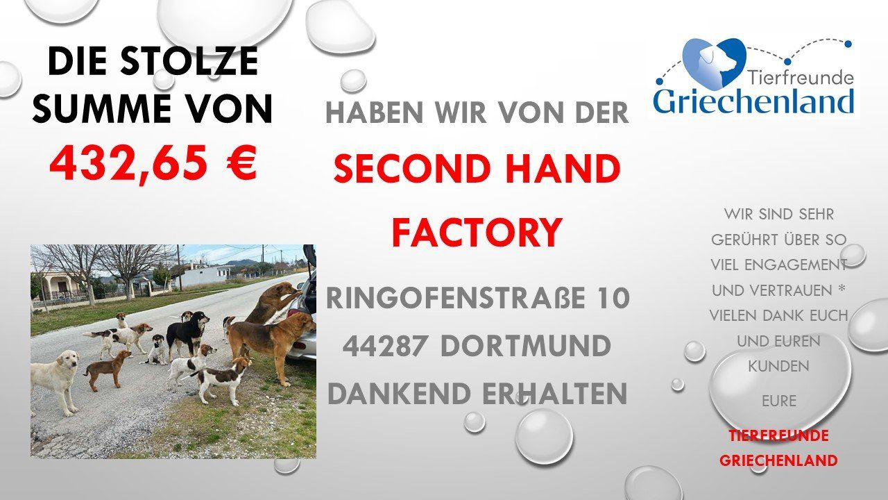 Die stolze Summe von 432,65 € haben wir von der Second Hand Factory https://www.facebook.com/secondhandfactory, Ringofenstraße 10 in 44287 Dortmund dankend erhalten -