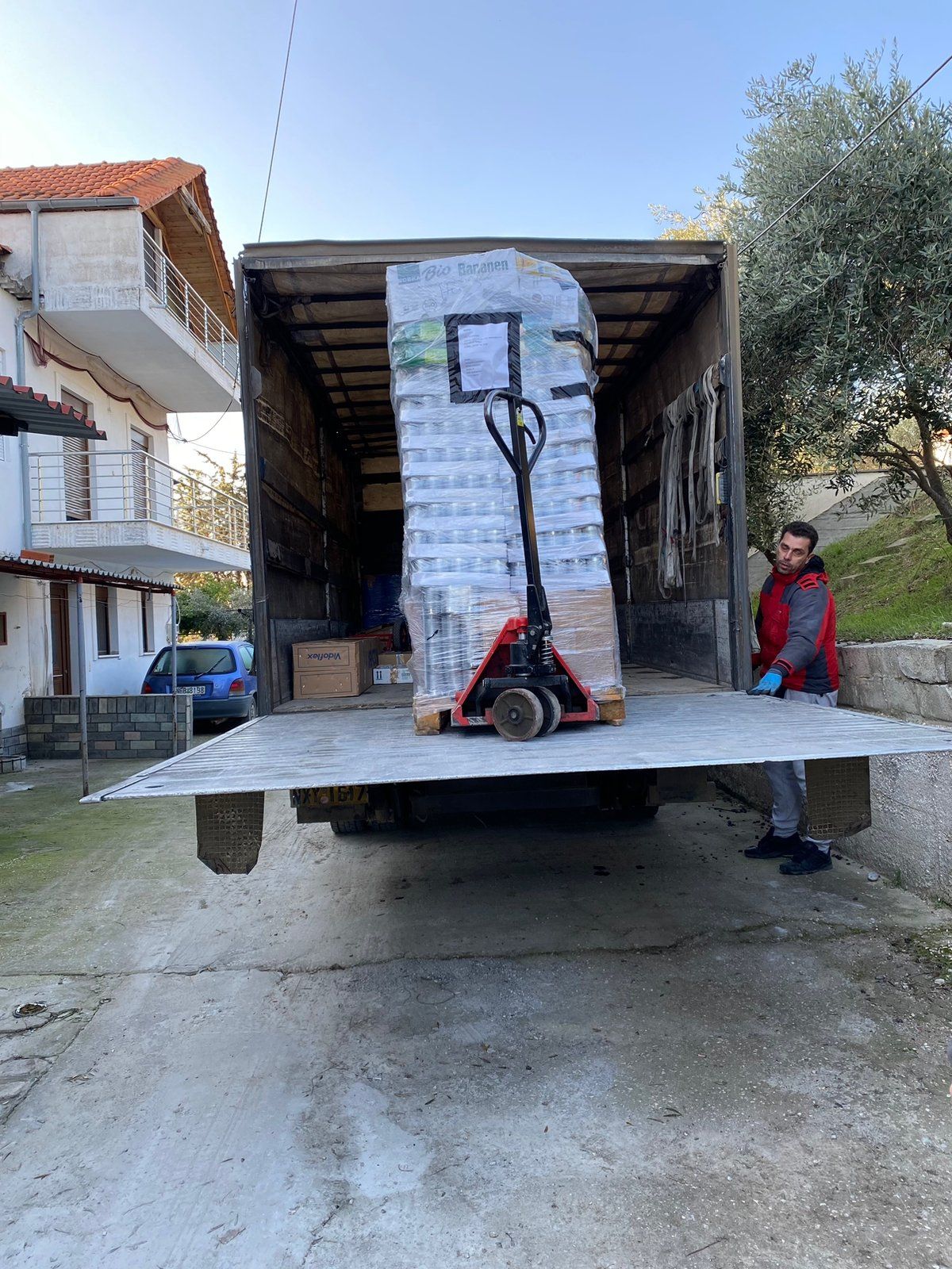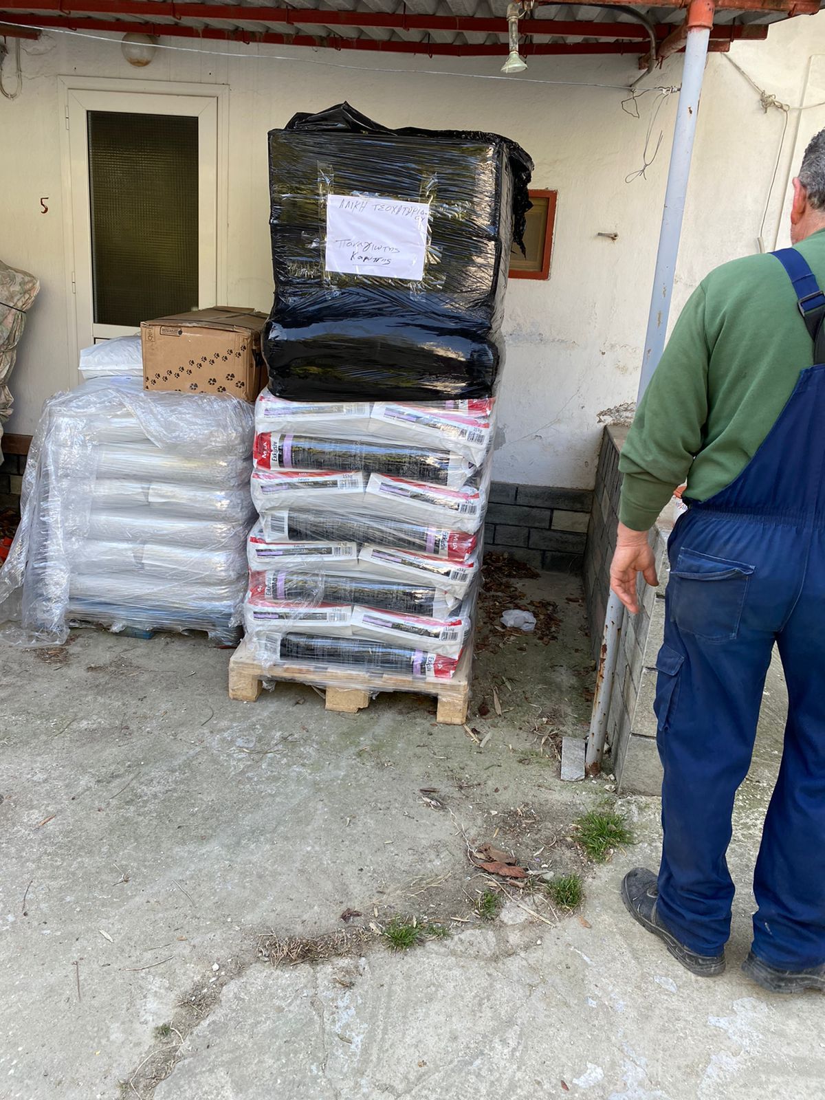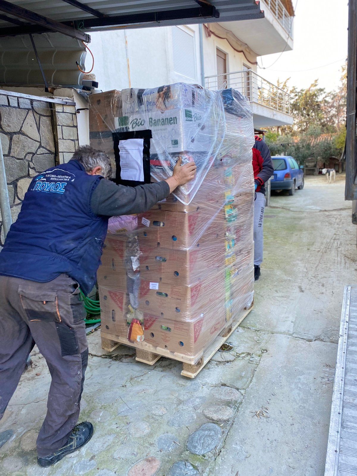 Unsere griechischen Freunde haben angefangen, die Paletten auszupacken. Dabei sind sie auf die vielen Geschenke gestoßen.