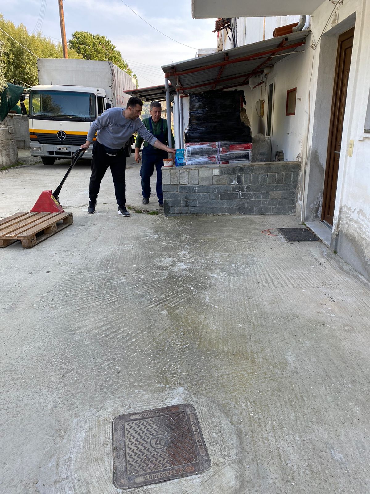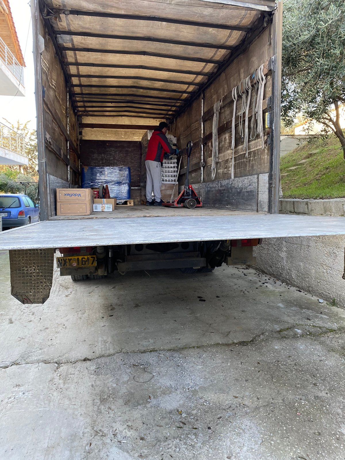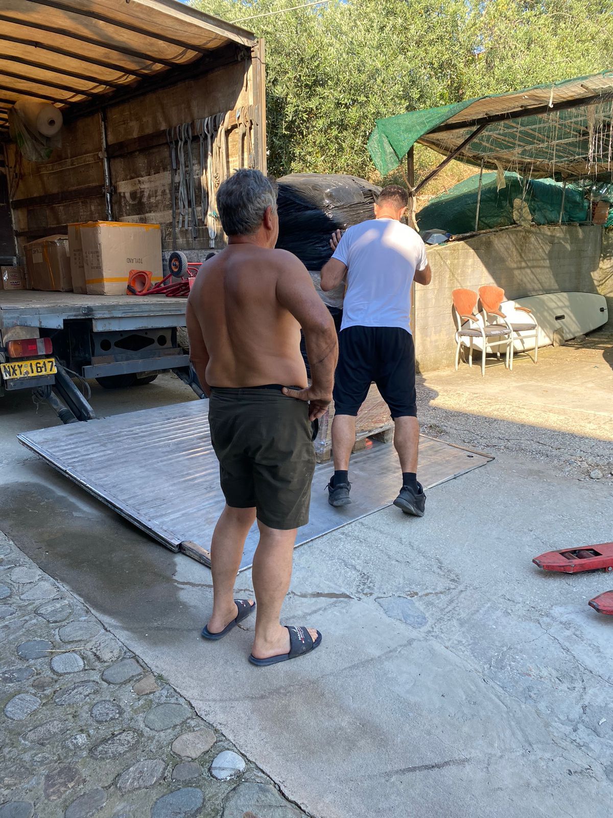 Unsere griechischen Freunde haben angefangen, die Paletten auszupacken. Dabei sind sie auf die vielen Geschenke gestoßen.