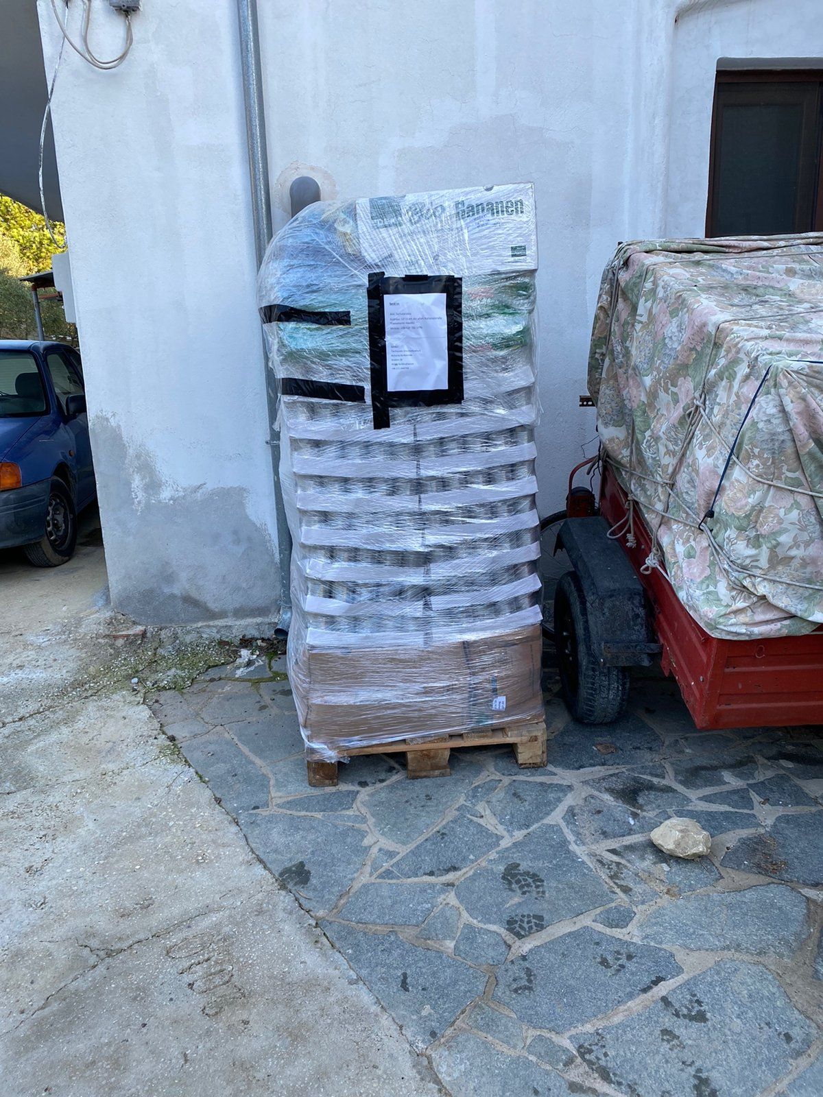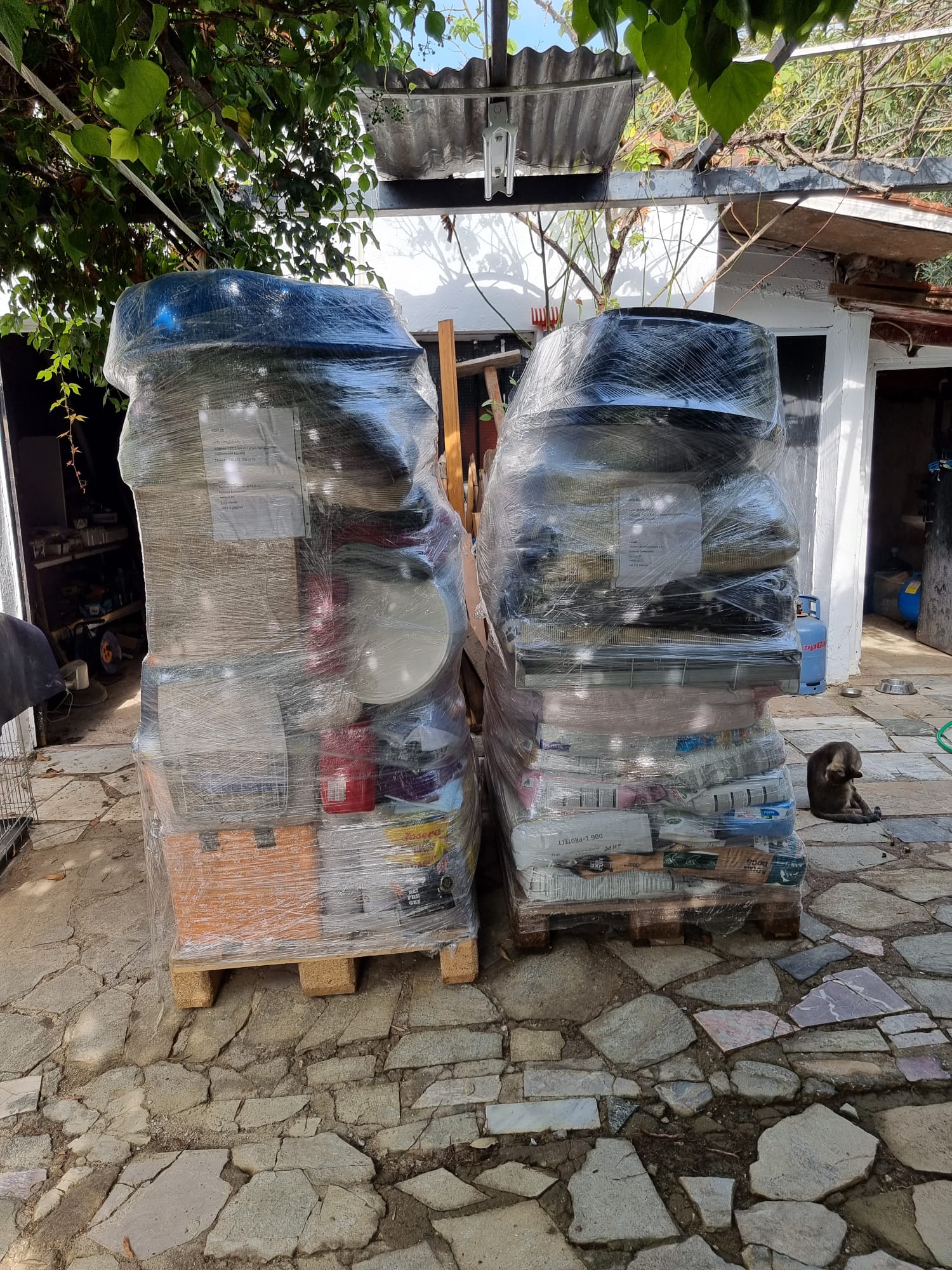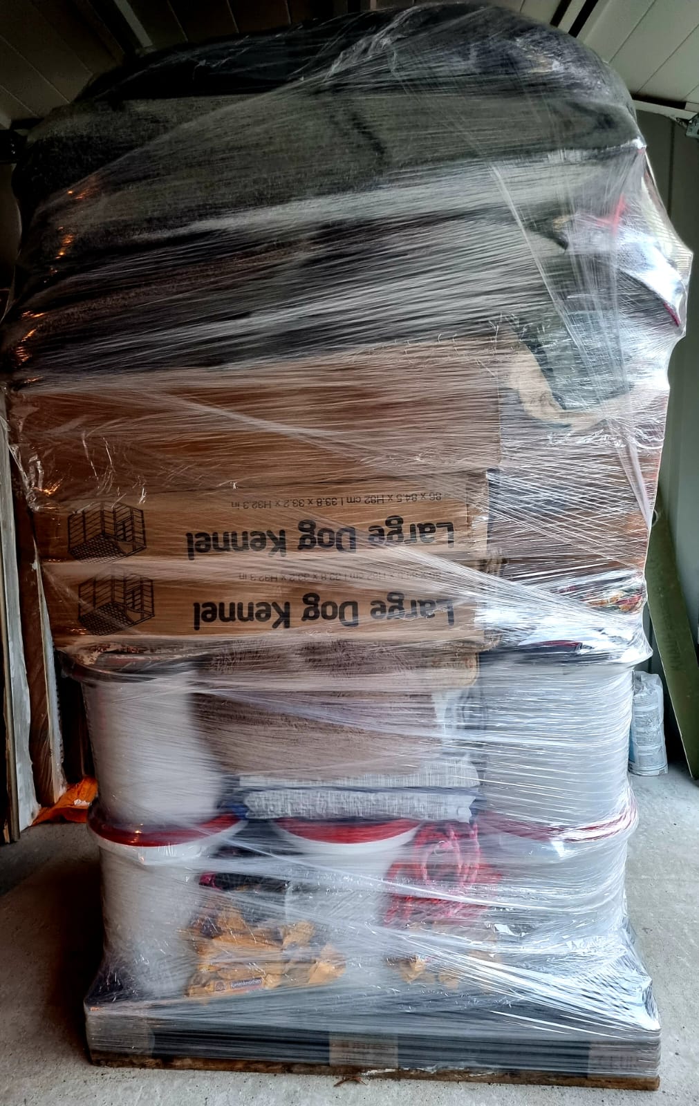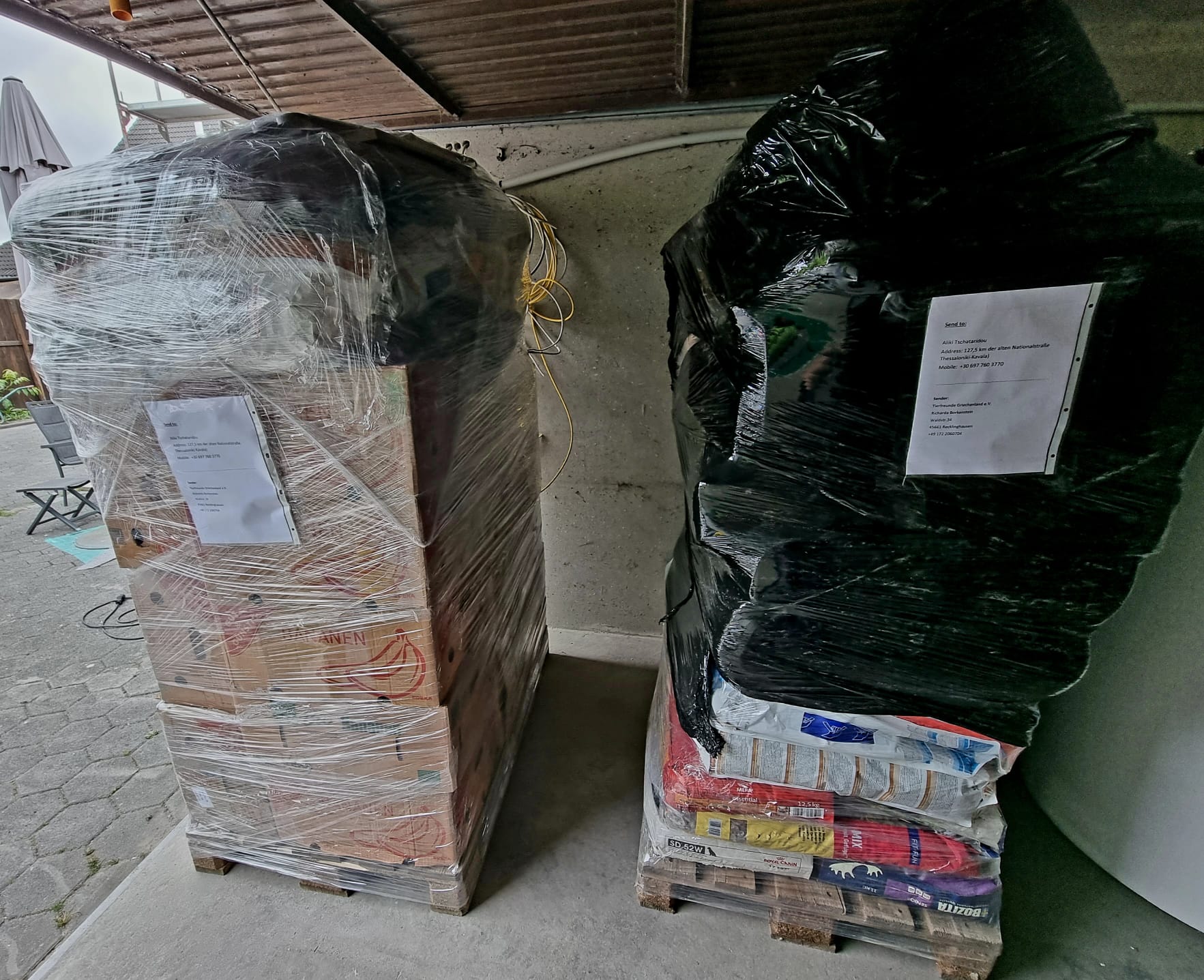 Mit vielen guten Dingen für unsere Hunde bestückt sind die zwei Paletten nun endlich abgeholt worden und werden nach Griechenland zu Aliki transportiert. Viele Spenden sind hier gut mit verpackt, vom Hundekörbchen über Futterboxen, gefüllt, Decken und Näpfe, Schatten bietende Hundehäuser… Und auch einiges an Hundefutter Leckerchen und medizinischen Bedarf, was von den Spendengeldern in Deutschland günstiger erworben werden konnte! Danke sagen wir allen Spenderrinnen und Unterstützern!