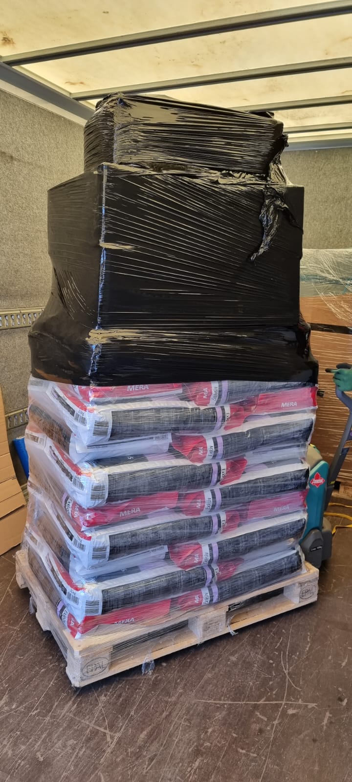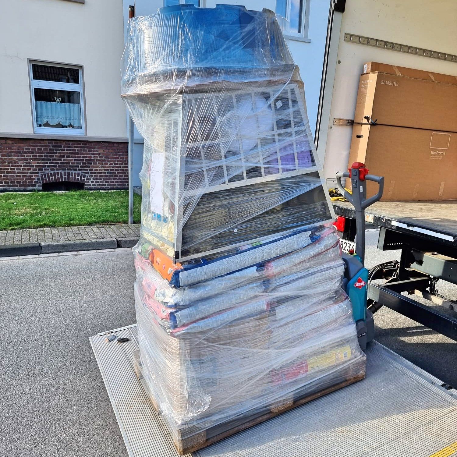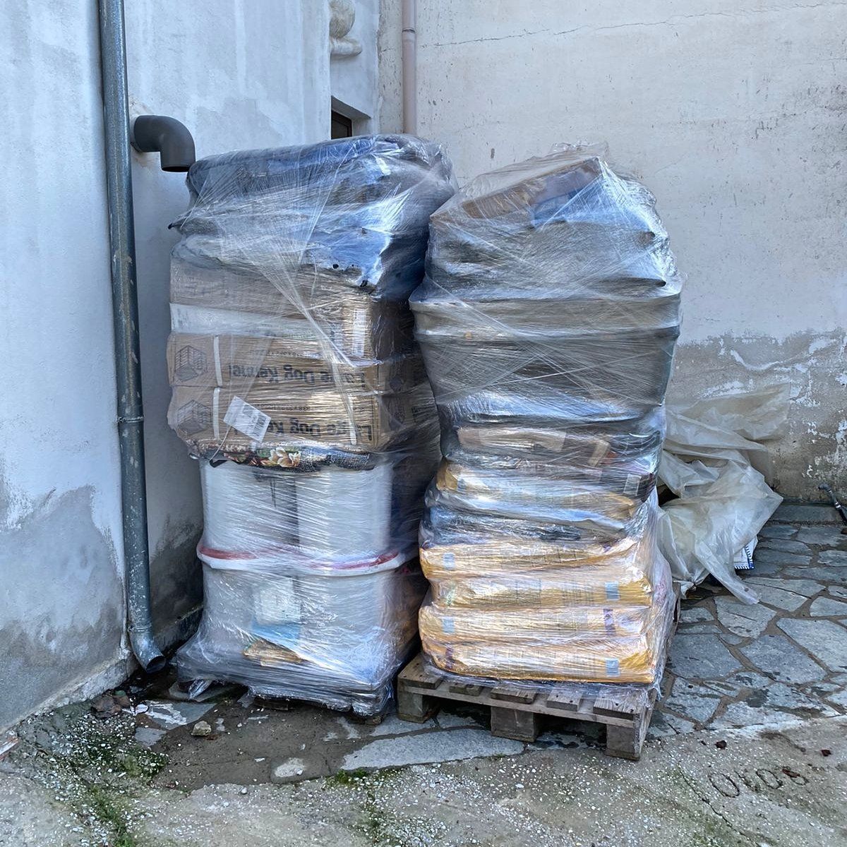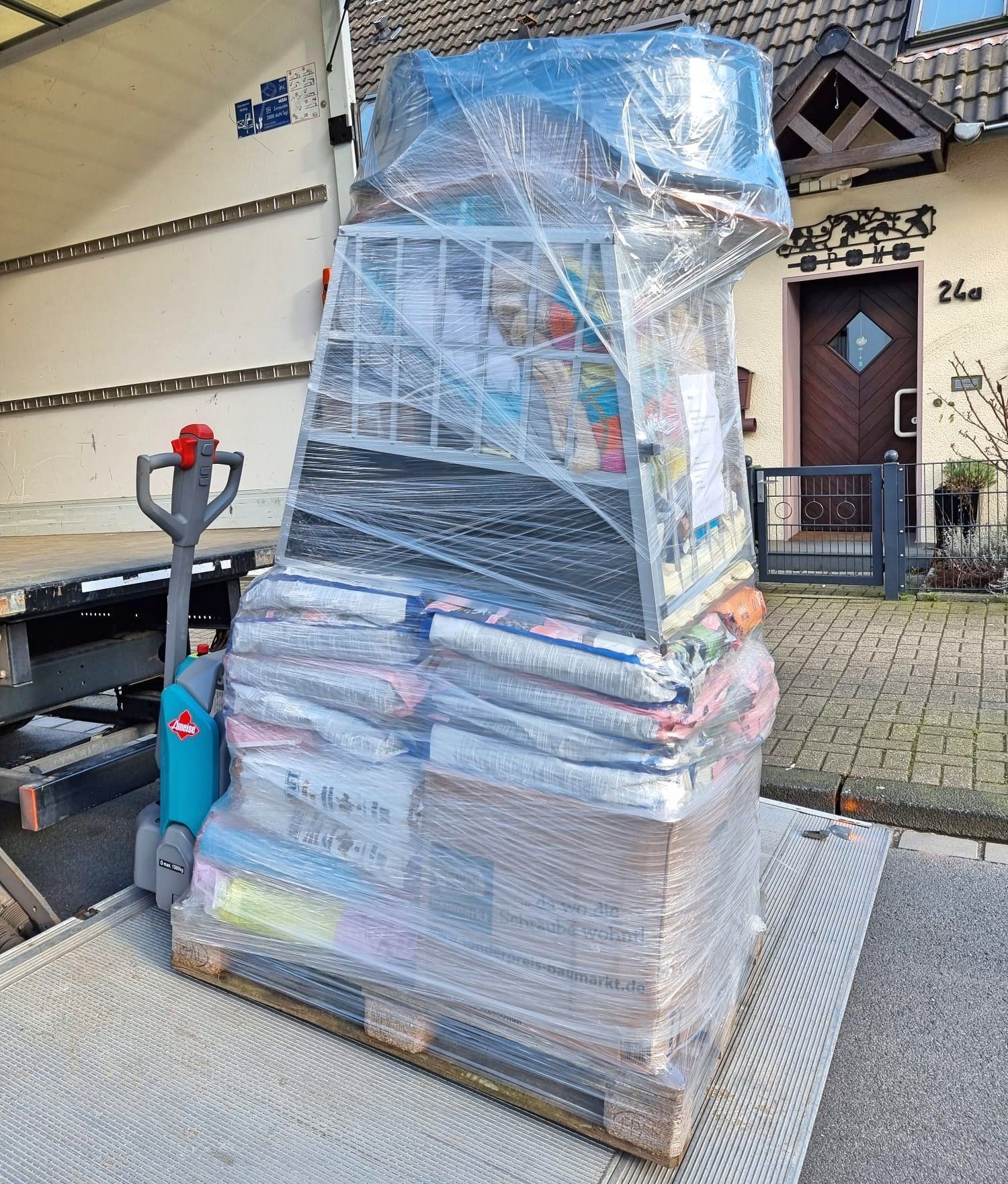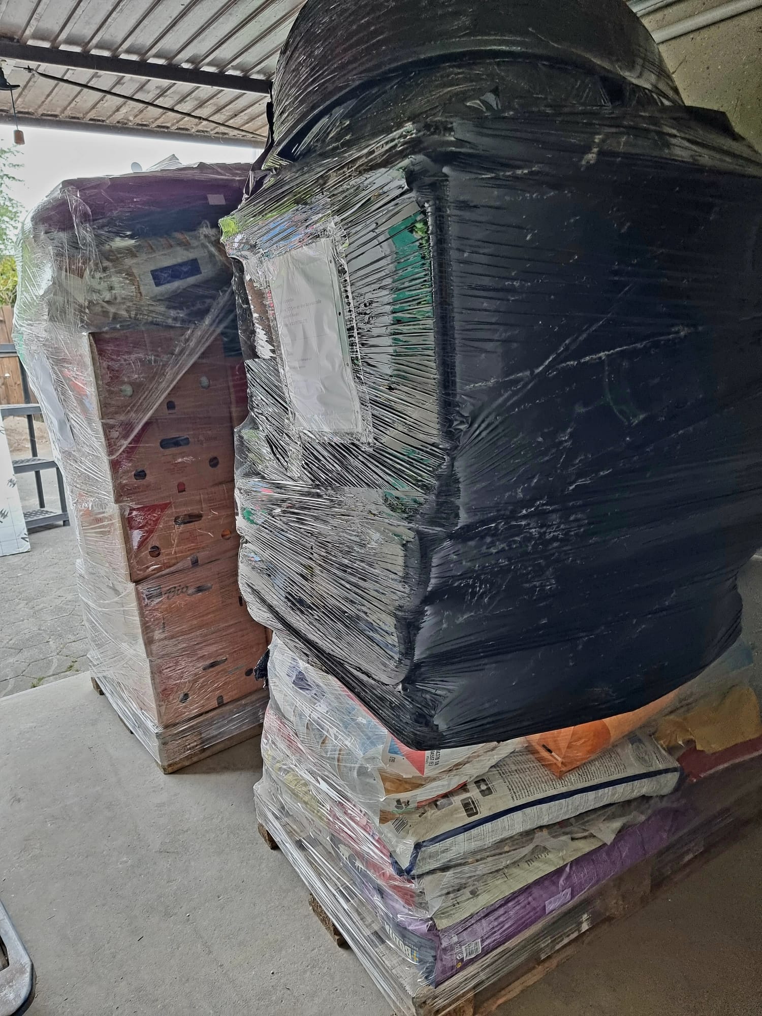 Mit vielen guten Dingen für unsere Hunde bestückt sind die zwei Paletten nun endlich abgeholt worden und werden nach Griechenland zu Aliki transportiert. Viele Spenden sind hier gut mit verpackt, vom Hundekörbchen über Futterboxen, gefüllt, Decken und Näpfe, Schatten bietende Hundehäuser… Und auch einiges an Hundefutter Leckerchen und medizinischen Bedarf, was von den Spendengeldern in Deutschland günstiger erworben werden konnte! Danke sagen wir allen Spenderrinnen und Unterstützern!