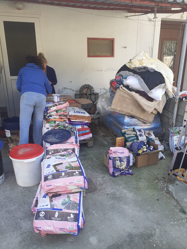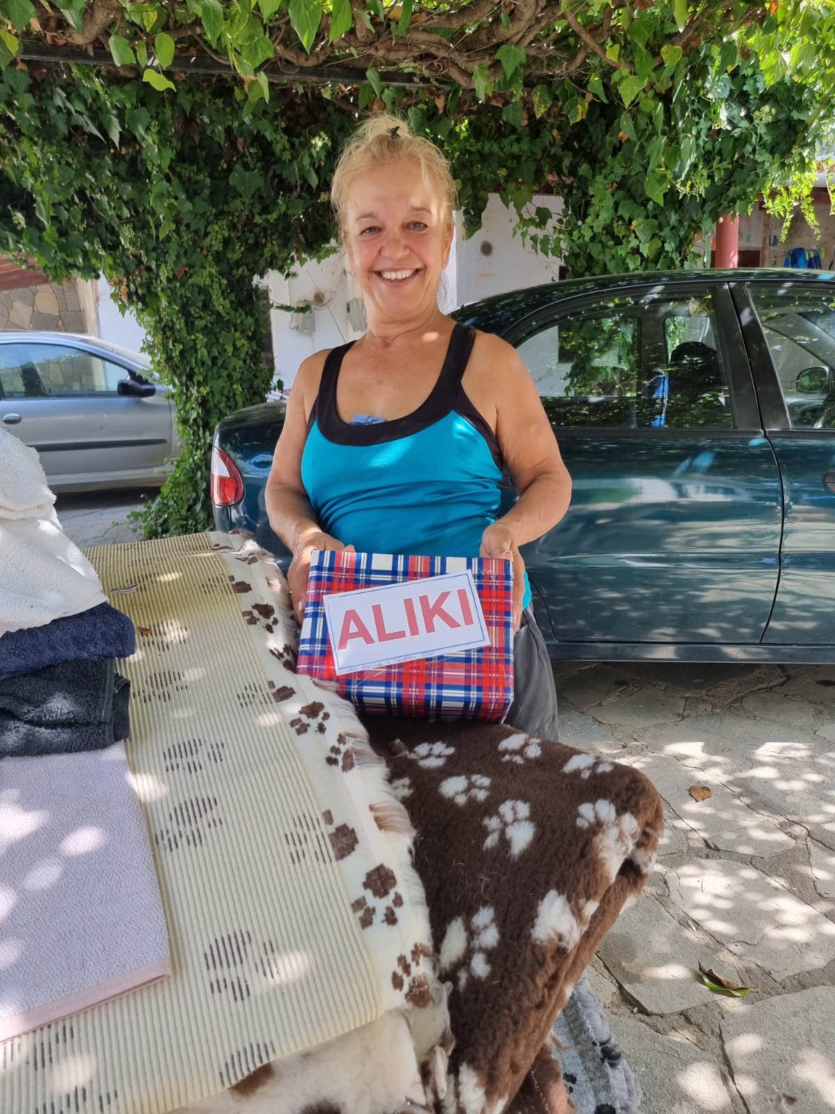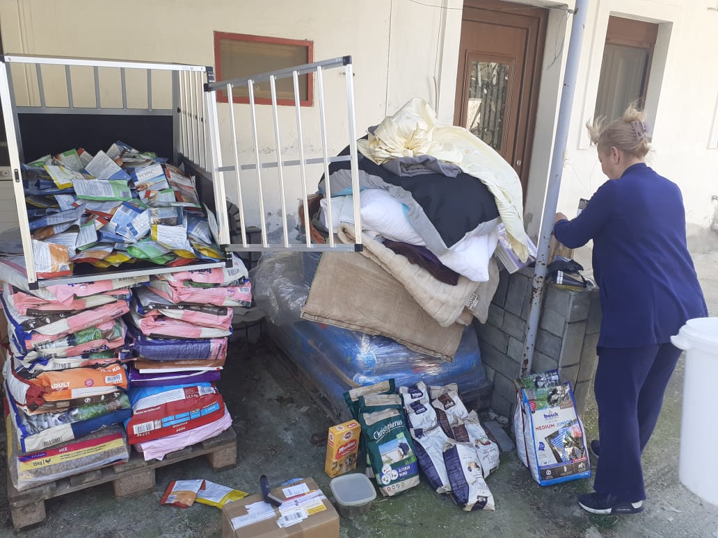 Ein Teil der Spenden, die wir mit dem letzten Transporter mitgeben konnten, sind bei Aliki angekommen. Die großen Portionen an Hundefutter gehen auf die nächste Palette, aber die leichteren Dinge wie Decken, Wassereimer, Müllsäcke, Spielzeug und kleinere Säcke Trockenfutter konnten bereits vorwegreisen. Alikis Auto ist vollgepackt und die ersten Hunde warten auf die Leckerchen.