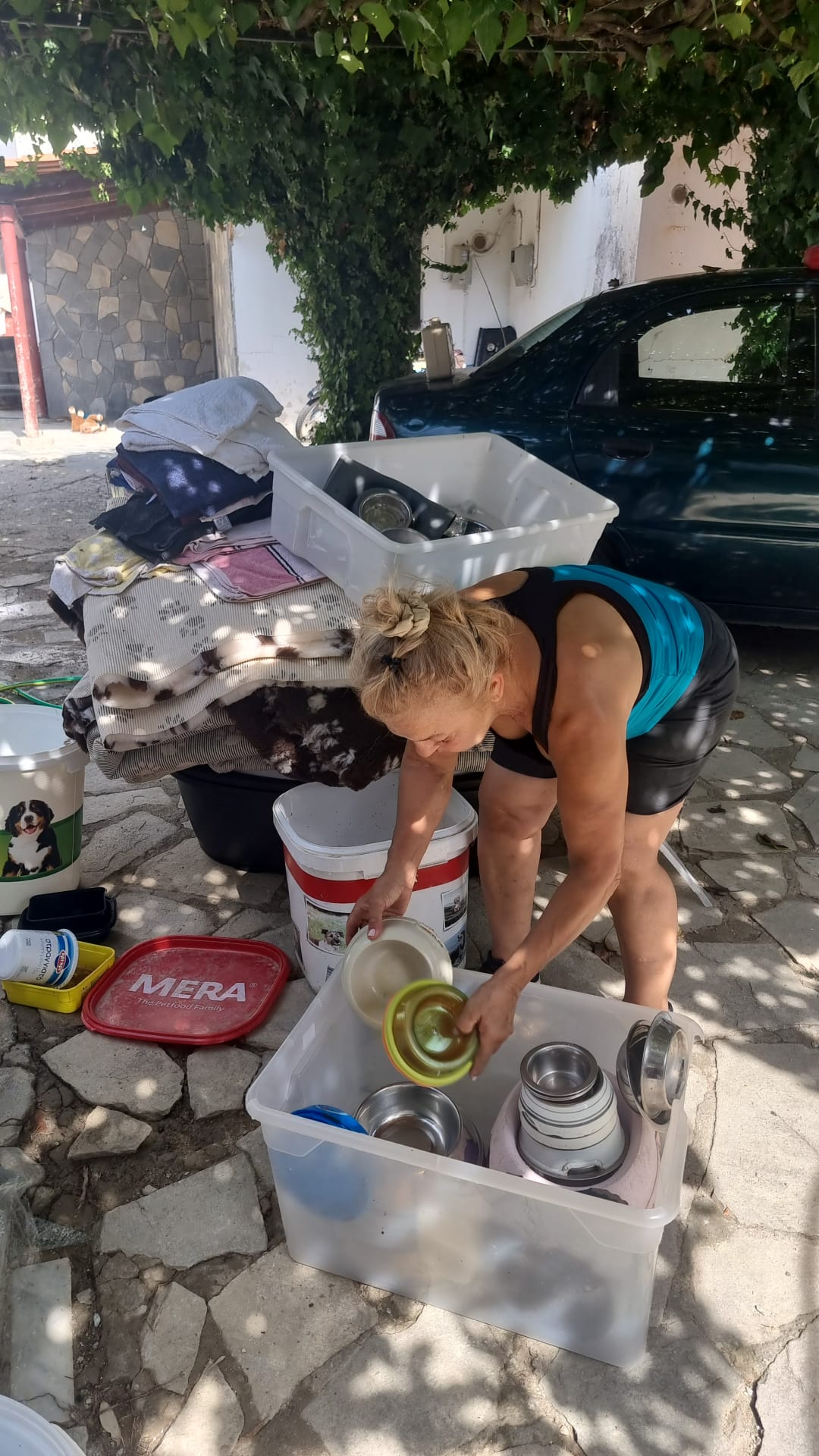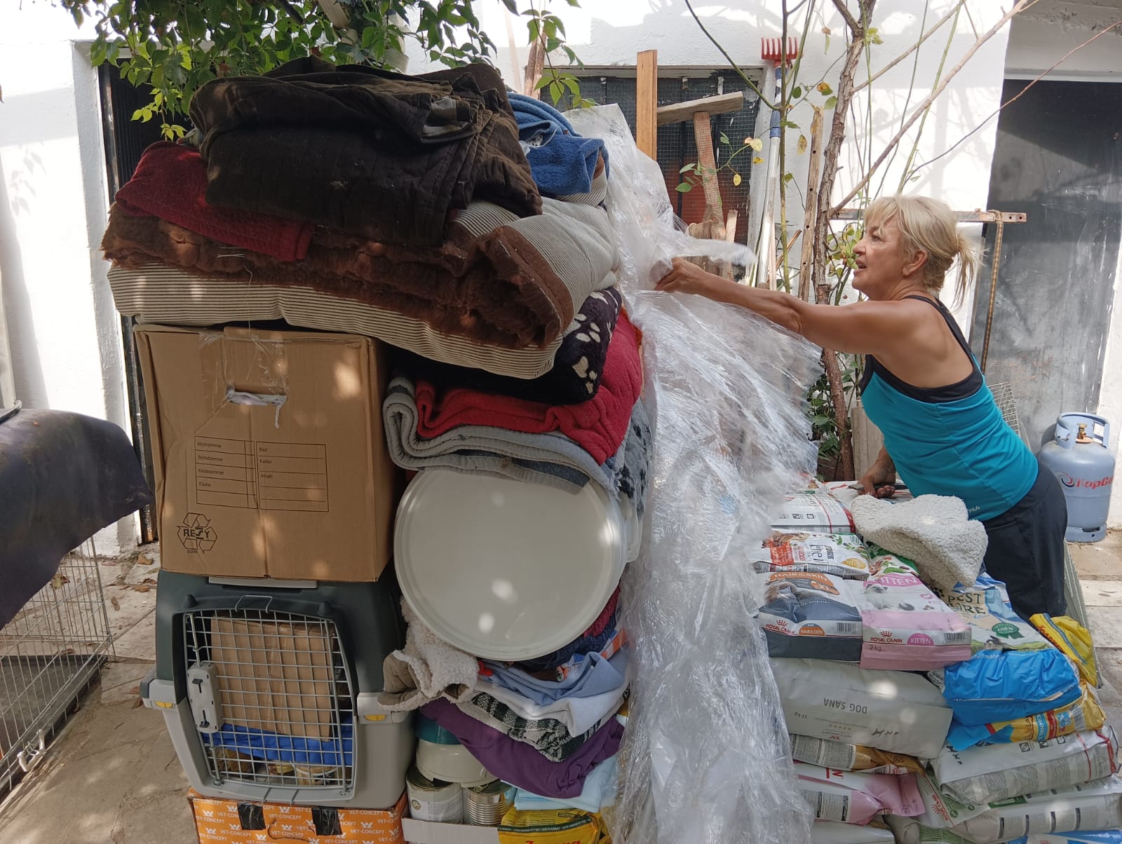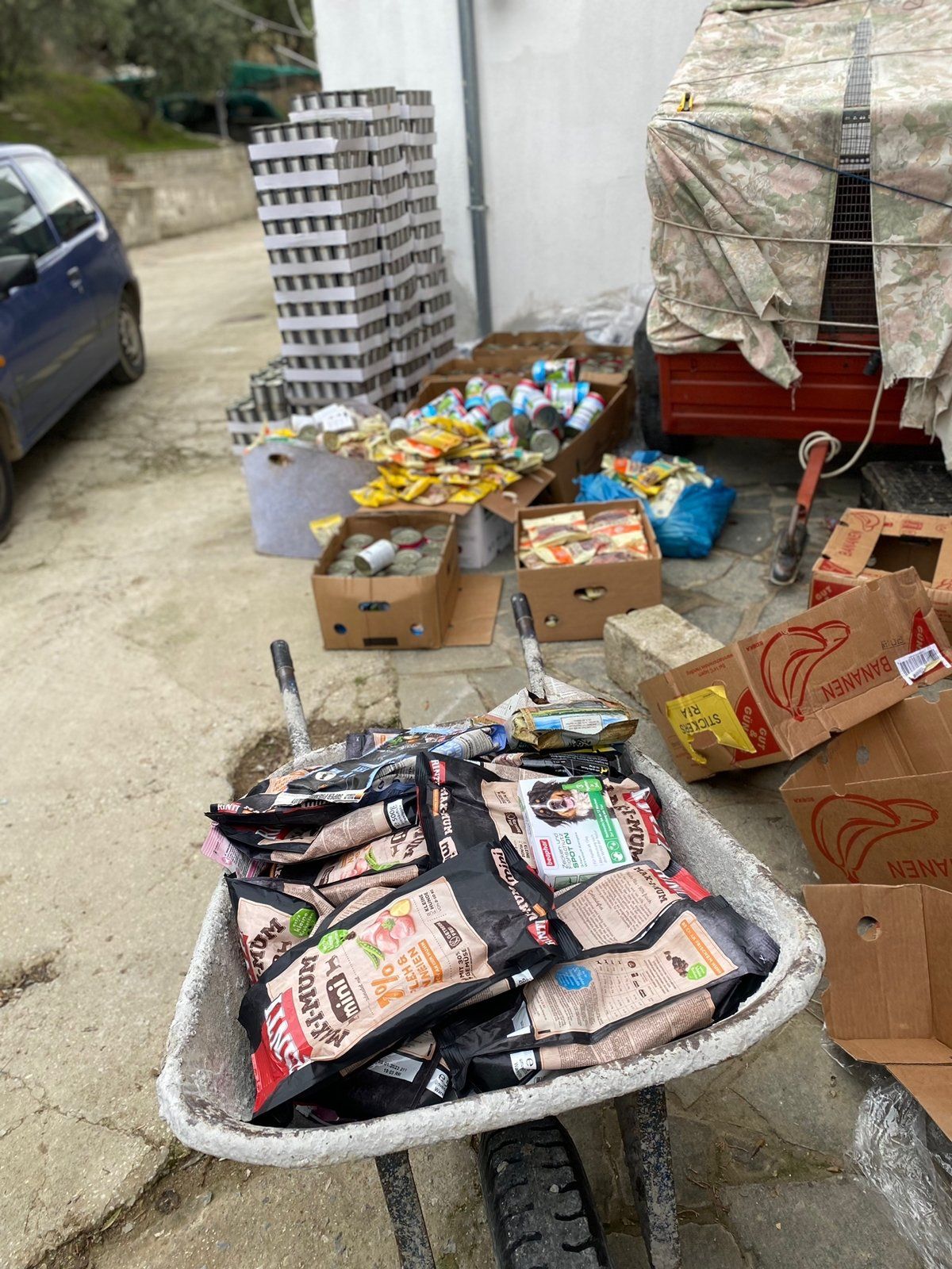 Ein Teil der Spenden, die wir mit dem letzten Transporter mitgeben konnten, sind bei Aliki angekommen. Die großen Portionen an Hundefutter gehen auf die nächste Palette, aber die leichteren Dinge wie Decken, Wassereimer, Müllsäcke, Spielzeug und kleinere Säcke Trockenfutter konnten bereits vorwegreisen. Alikis Auto ist vollgepackt und die ersten Hunde warten auf die Leckerchen.