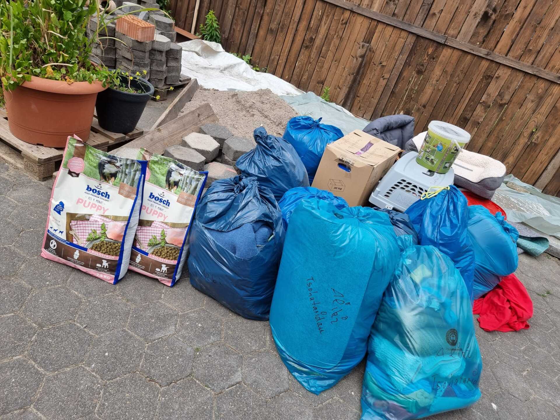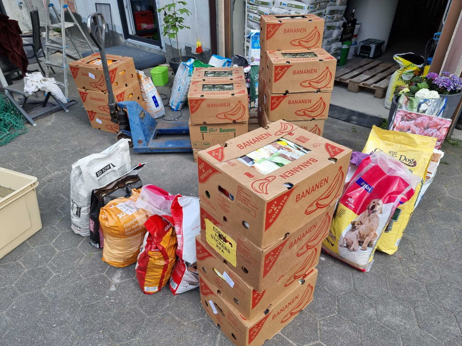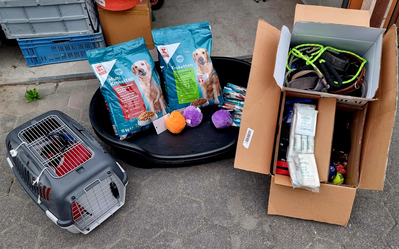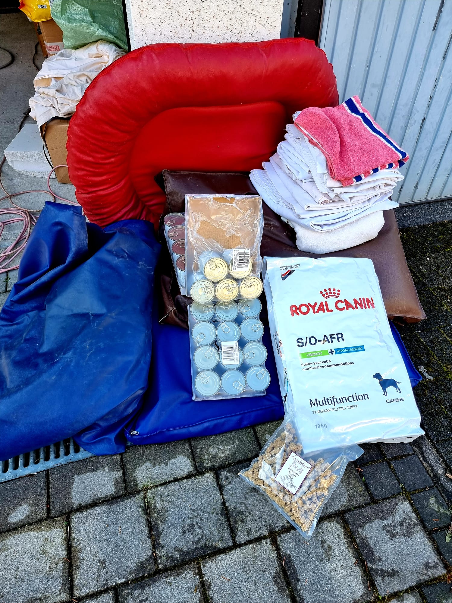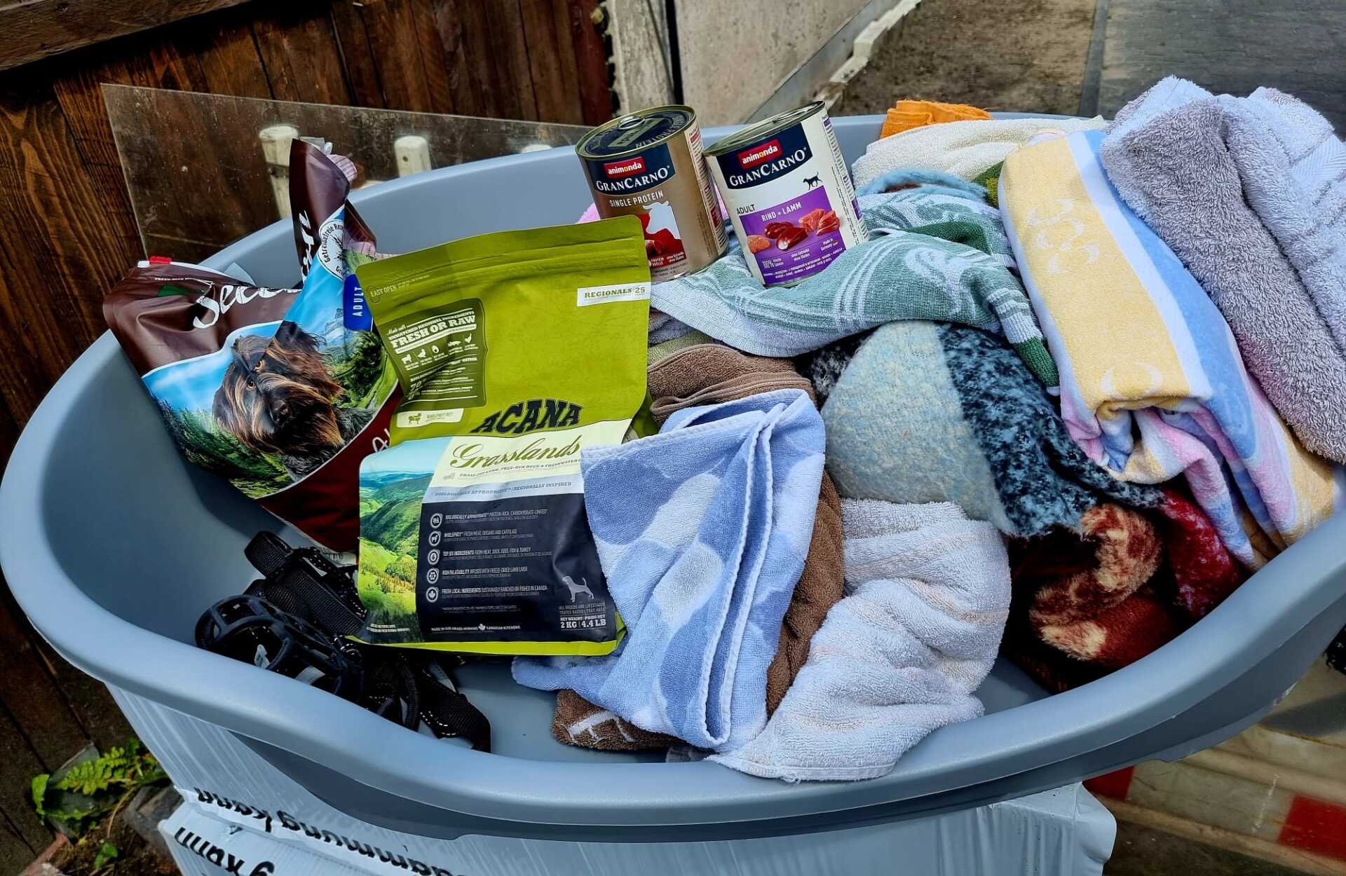 TrendPet 💕, Zum anderen hat die Familie Heidrichs aus Siegburg gesammelt und Decken, Handtücher, Geschirre, Näpfe und Körbchen schon gut in stabile Kisten verpackt ♥️und gerade noch durfte ich eine schwere Kiste mit Hundefutter und Kauknochen, mit Rinderhaut und Leckerchen vom