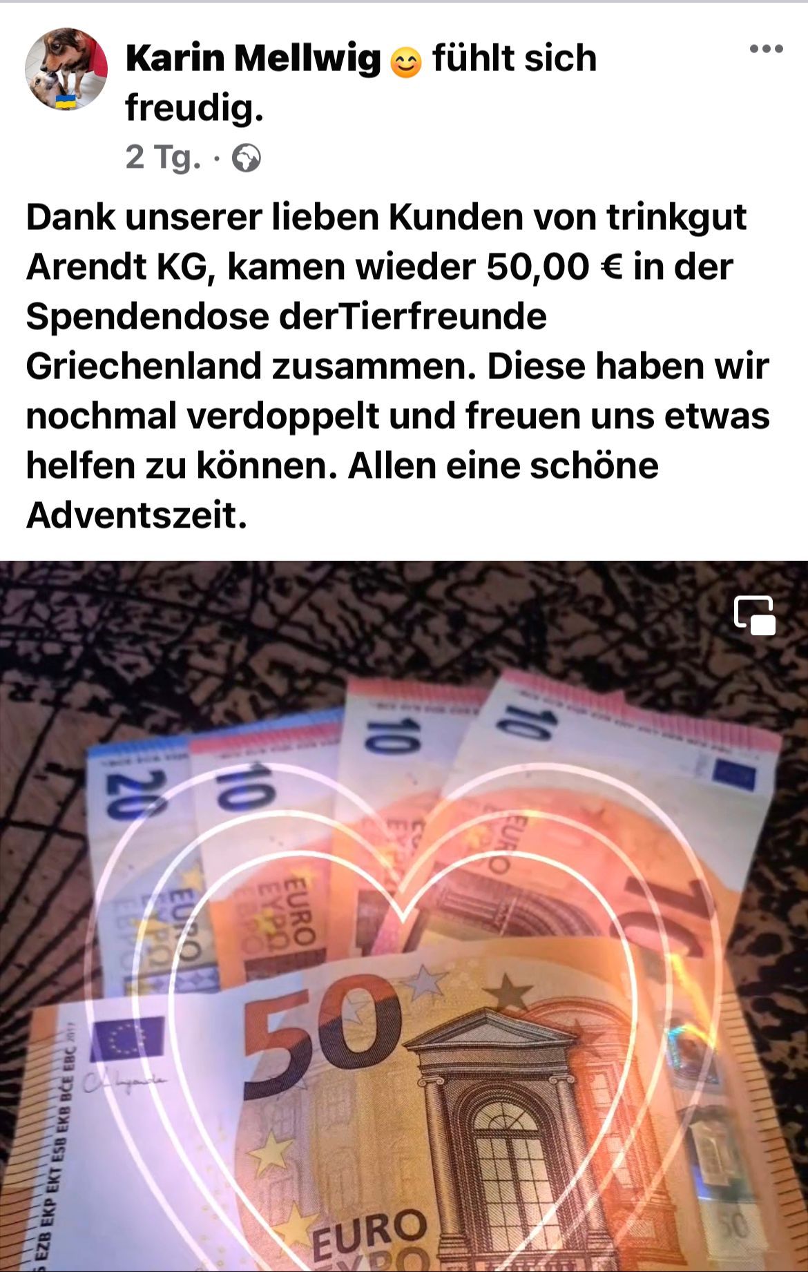 Es sind wieder 230 Euro für unsere Tierfreunde Griechenland e.V. zusammen gekommen. Trinkgeld Arendt KG in Königshardt.