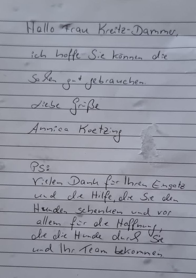 "Im Namen von uns allen und unseren Hunden hier sagen wir danke schön für die wunderbaren Dinge, die ihr uns gesendet habt. Es macht uns Mut, mit unserer Arbeit weiterzumachen. Allein der Gedanke an euch, an Menschen, die uns helfen wollen, hilft.