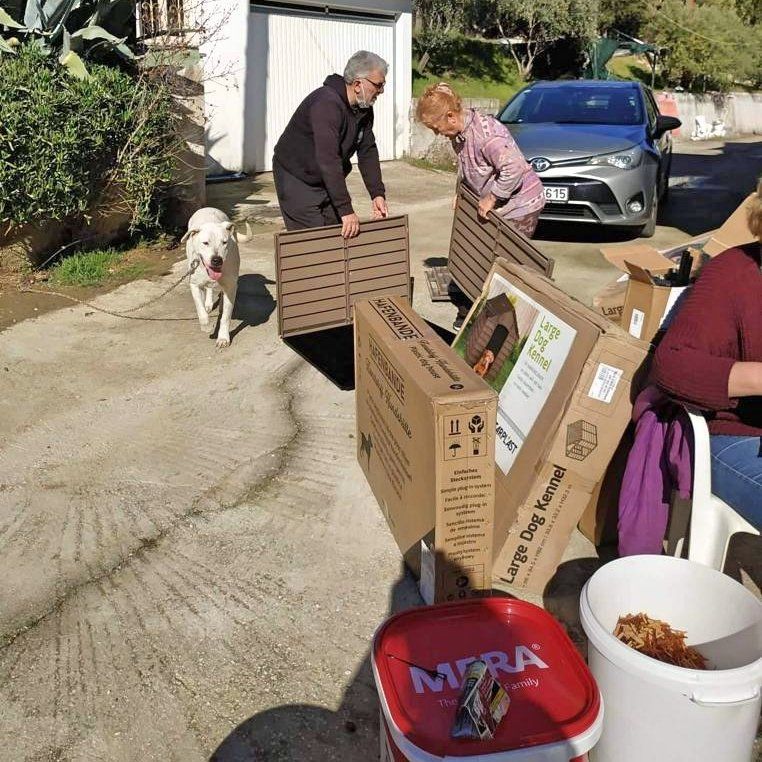 Gestern hatten unsere Tierschützer vor Ort, Aliki, Marijke, Villi, George und Theo alle Hände voll zu tun - warum? Die Spendenpaletten sind angekommen, hier sind ganz viele Decken, Schmutzfangmatten, Hundehütten, Mistboys, Futter, Spielsachen.... usw. enthalten. Die Hütten wurden bereits aufgebaut und werden jetzt verteilt. Alles wird akurat geordnet und sortiert, auch die Probepäckchen mit Futter werden von Hand umgefüllt. Ein schöne Arbeit unter freiem Himmel mit den ersten Sonnenstrahlen. Im Griechenland wird es so langsam Frühling!! Ευχαριστώ αγαπητοί βοηθοί για τα πολλά χέρια που κάνουν τόσο καλό!!