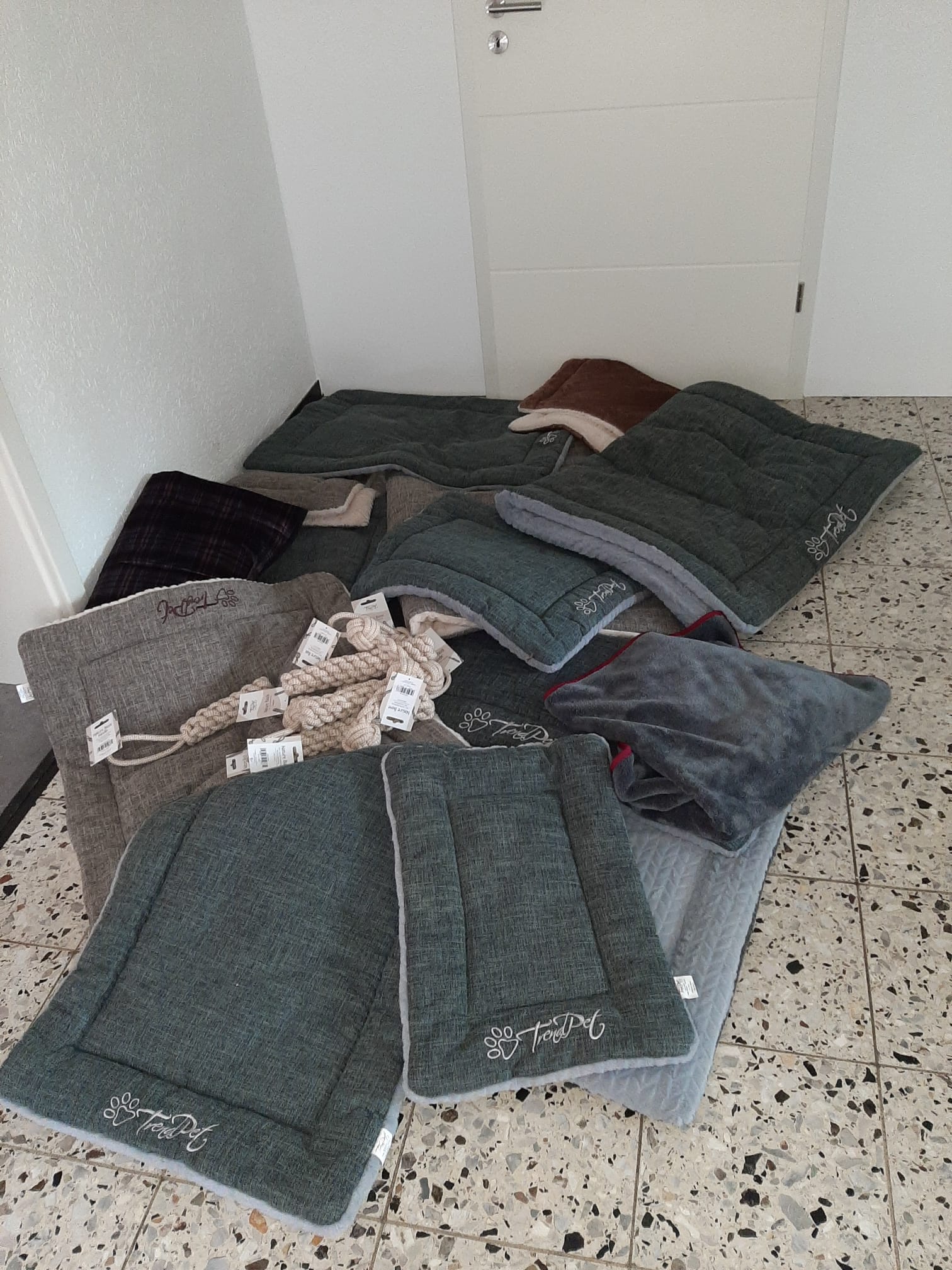 Heute ist unser Glückstag! Drei edle Spender/innen haben uns reich bestückt, alles kommt noch mit auf die Palette Richtung Griechenland 🇬🇷. Zum einen gibt es jede Menge Decken, Liegeplätze und Wurfspielzeug von der Firma