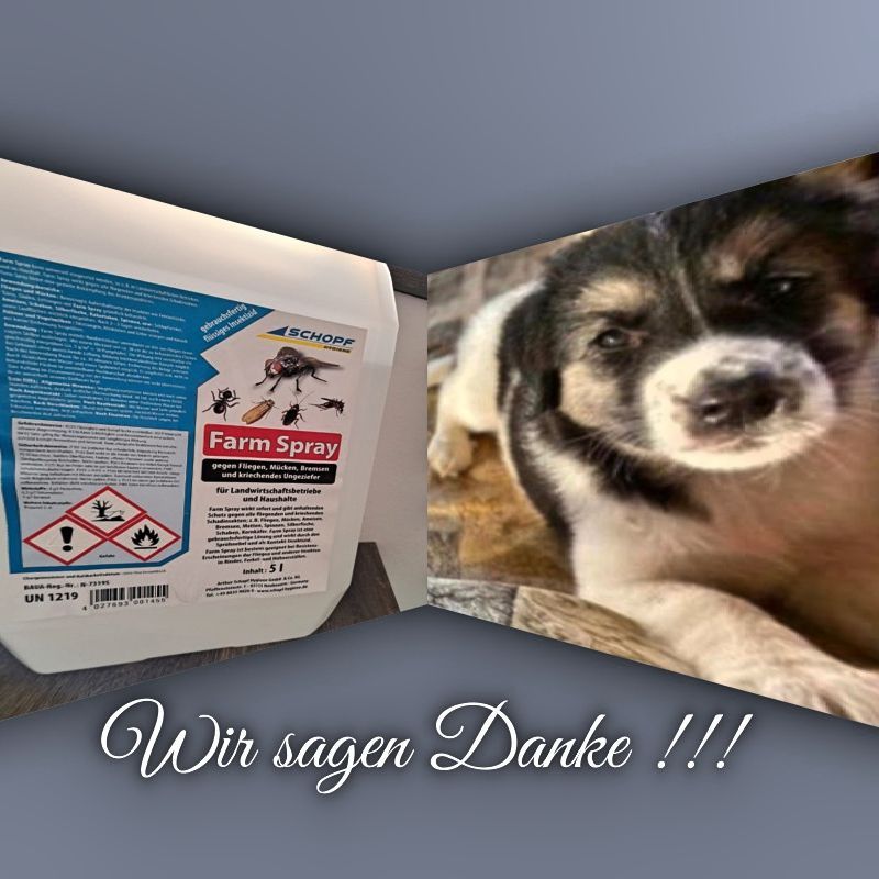 Herzlichen Dank, schicken wir an Familie Präbst, die im letzten Jahr unseren hübschen Megalo, nun Gustel, adoptiert haben. Sie haben auf unseren Aufruf reagiert, da mit dem Frühling in Griechenland nicht nur die Sonne, sondern leider auch jede Menge Insekten erscheinen, die unseren Hunden gefährlich werden können. Eine Behandlung der Boxen und Flächen vorweg mit diesem Farmspray hilft, Filarien durch Insektenstiche, zum Beispiel zu verhindern oder zumindest einzuschränken. Aliki wird begeistert sein und wir sind sehr sehr dankbar. Mit der Palette geht dieser 5 l Kanister schnell auf die Reise nach Kavala. Herzlichen Dank, ihr Lieben Präbsts !!!