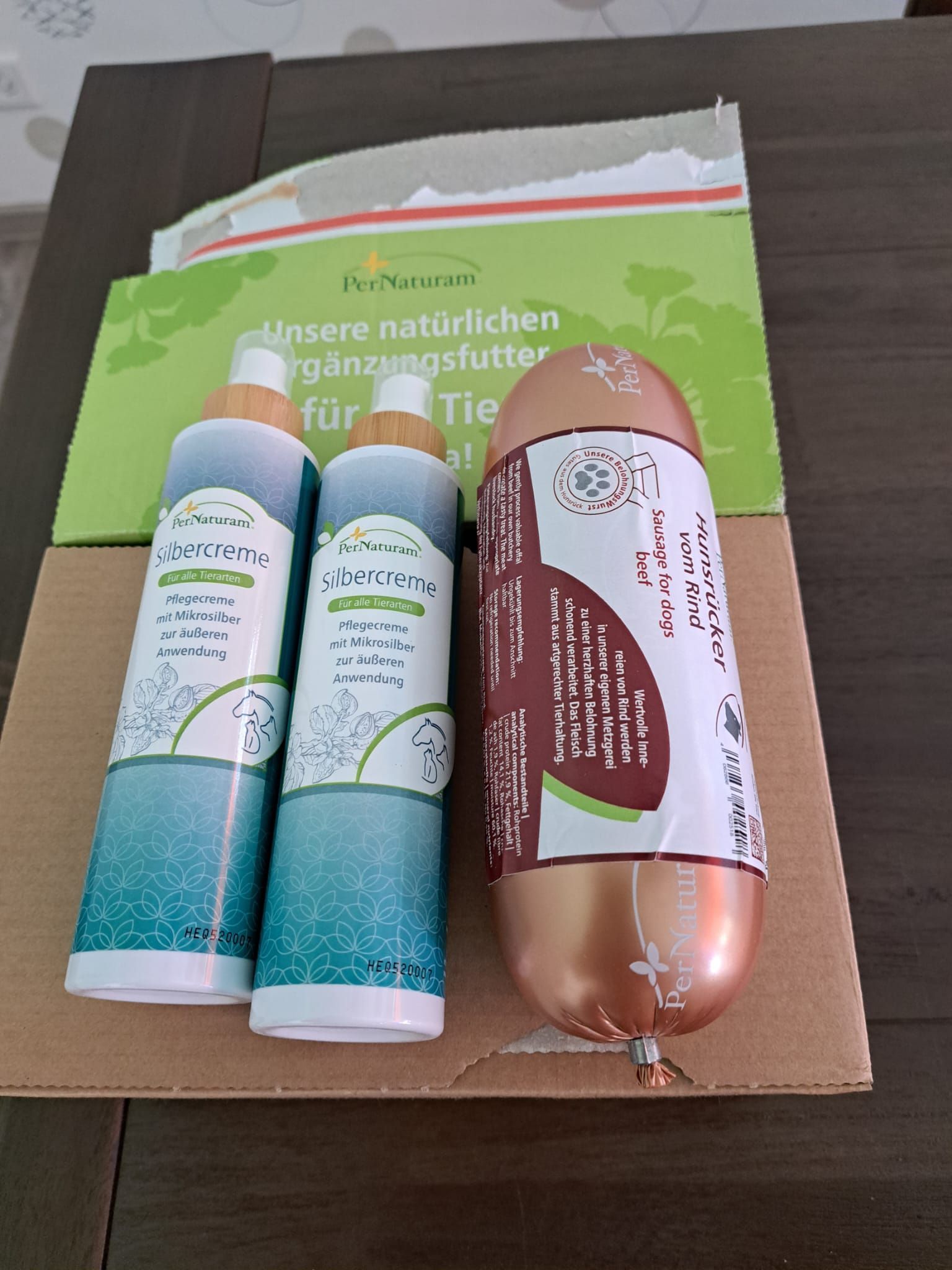 Zwei Flaschen Silbercreme für Lennys Haut hat uns Renate Koutawas geschickt, zusammen mit einer extra Portion Rindfleisch, er wird es lieben, vielleicht ja seinen 🐕 Kumpeln im Lazarett ein bisschen abgeben, ich glaube, da wird Aliki schon für sorgen.