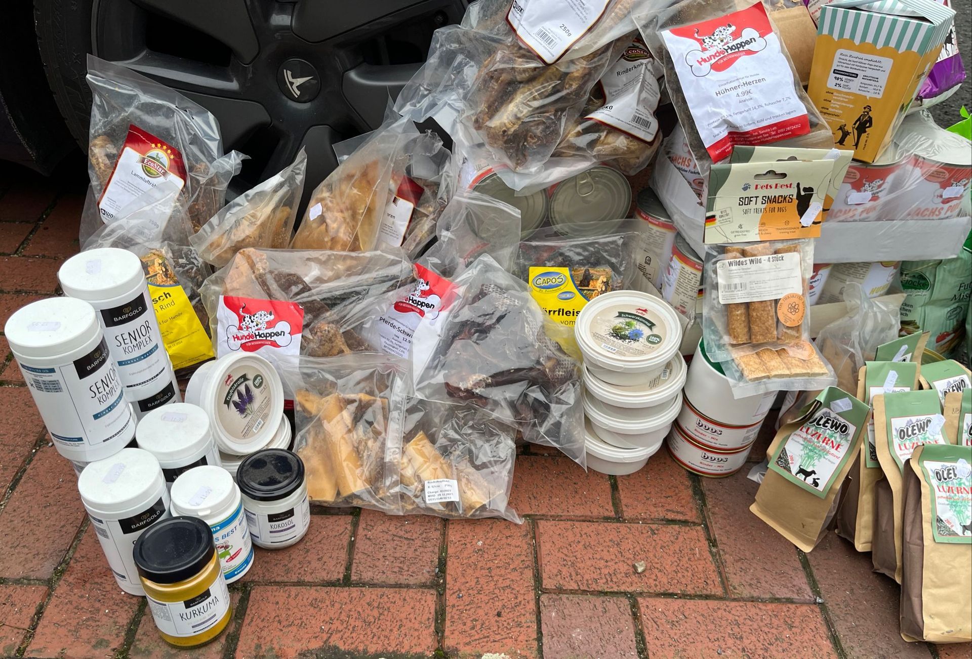Ein ganzer Anhänger voll Leckerchen ist uns gespendet worden. Dank des Pfotenverband e.V. können wir unsere Hunde in Griechenland zwischendurch mal mit etwas anderem verführen. Hier mal eine Kaustange, da mal ein leckerer Hundeknochen, wir können uns alle sicher vorstellen, wie begeistert die Hunde im Tierheim sein werden. Herzlichen Dank für diese großzügige Spende, die mit dem nächsten Transporter schnell zu unseren Hunden geht.