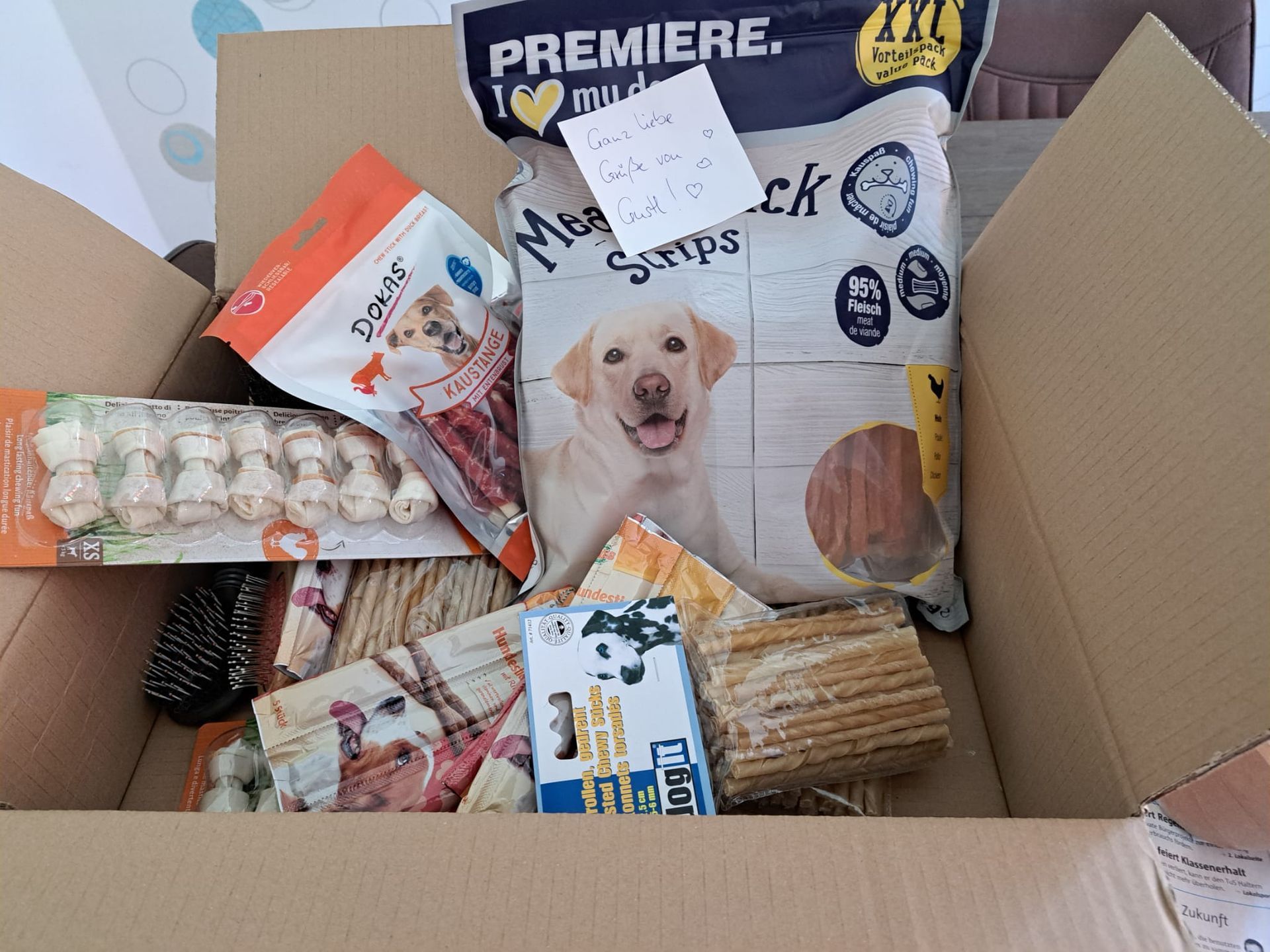 Die Adoptiveltern von unserer Nalina, jetzt Jette, haben uns, genauso wie die neuen Eltern von Georgia, für die verbleibenden Hunde in Griechenland 🇬🇷 etwas zu knabbern mitgebracht. Sowohl die Kaustangen als auch die Hähnchenstreifen oder andere Leckereien, alles wird eine Abwechslung zum Trockenfutter sein, und die Hunde vor Ort eine Weile beschäftigen. Herzlichen Dank, dass ihr nicht nur an euer neues Familienmitglied gedacht habt, sondern auch an die zurückgebliebenen.