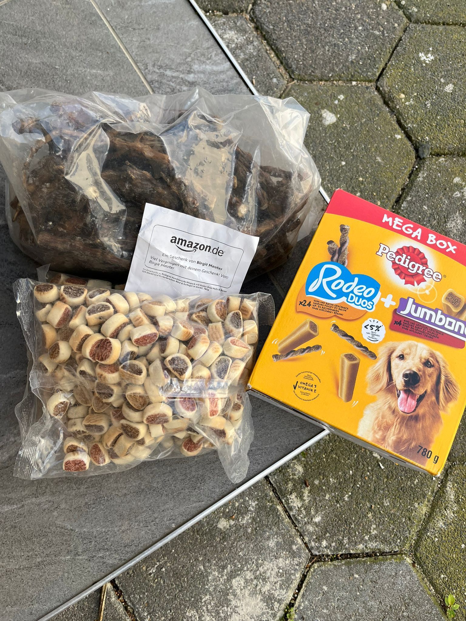 Es ist immer wieder schön, wenn Adoptanten von unseren Fellnasen sich an uns erinnern und uns herzliche Grüße schicken. Besonders schön ist es, wenn, wie dieses Mal, diese lieben Grüße nicht alleine kommen, sondern mit so leckeren Hundeknochen Kaustangen und vielem mehr. Auch ein Geschirr hat Familie Messingschlager hinzugefügt. Herzlichen Dank. 💙