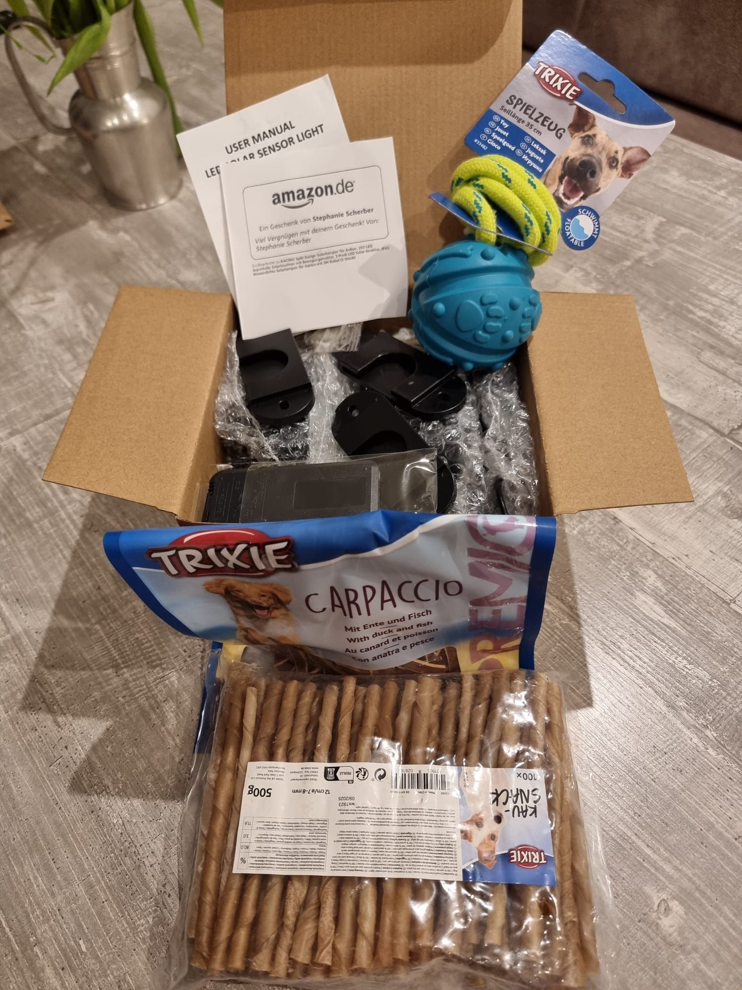 Ein herzliches Dankeschön geht an Karl-Heinz Schmidt. Er hat uns über Amazon nicht nur das Lachs und Reis Hundefutter geschickt, er hat auch noch drei Tüten Leckerchen ergänzt und zwei Spielzeugteile, da werden sich unsere Griechen freuen, wenn sie zum einen satt und verwöhnt werden und zum anderen dann die Kalorien gleich wieder abtoben dürfen. Und in einem zweiten Paket kamen dann auch noch Solar leuchten, für unser Tierheim in Mirtofito, mit denen wir ein weiteres Gebiet auf dem Gelände ausleuchten können. Herzlichen Dank 💙🥰
