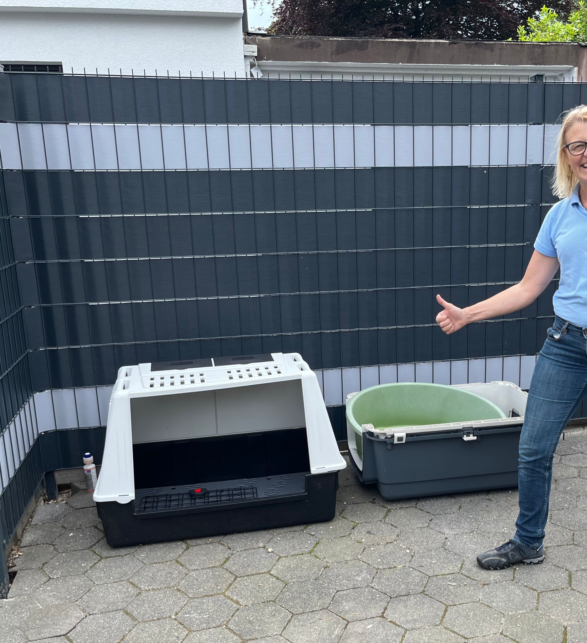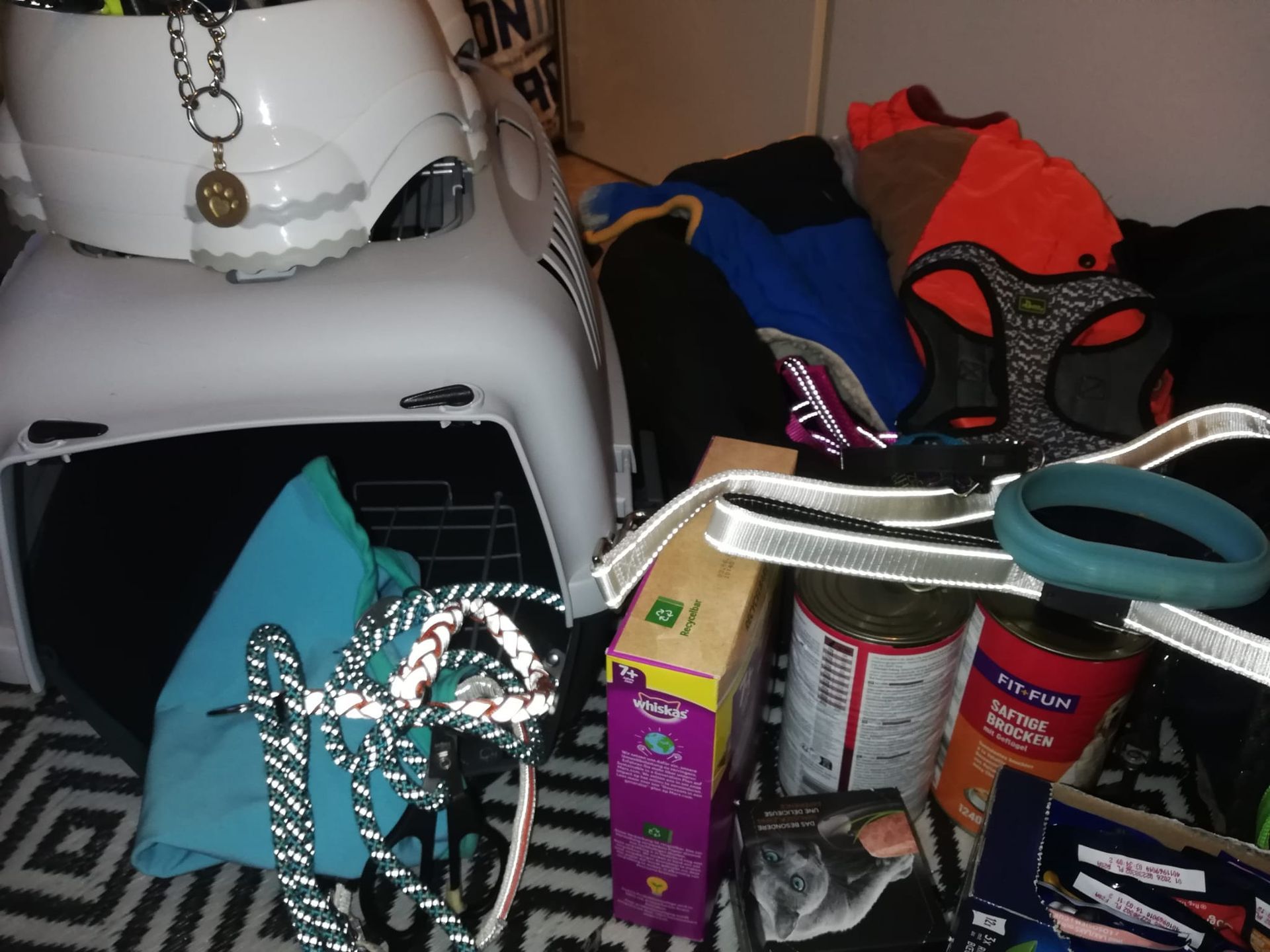 Über eBay Kleinanzeigen sind diese beiden größeren Transportboxen nun gekauft und für unsere Tierarztfahrten gespendet worden. Mit viel Gelächter und Kreativität konnten beide inklusive des Körbchens in einen Tesla verfrachtet werden, als Cabrios zerpflückt, sie sind nun bereit für die Palette, die nächste Woche gepackt wird