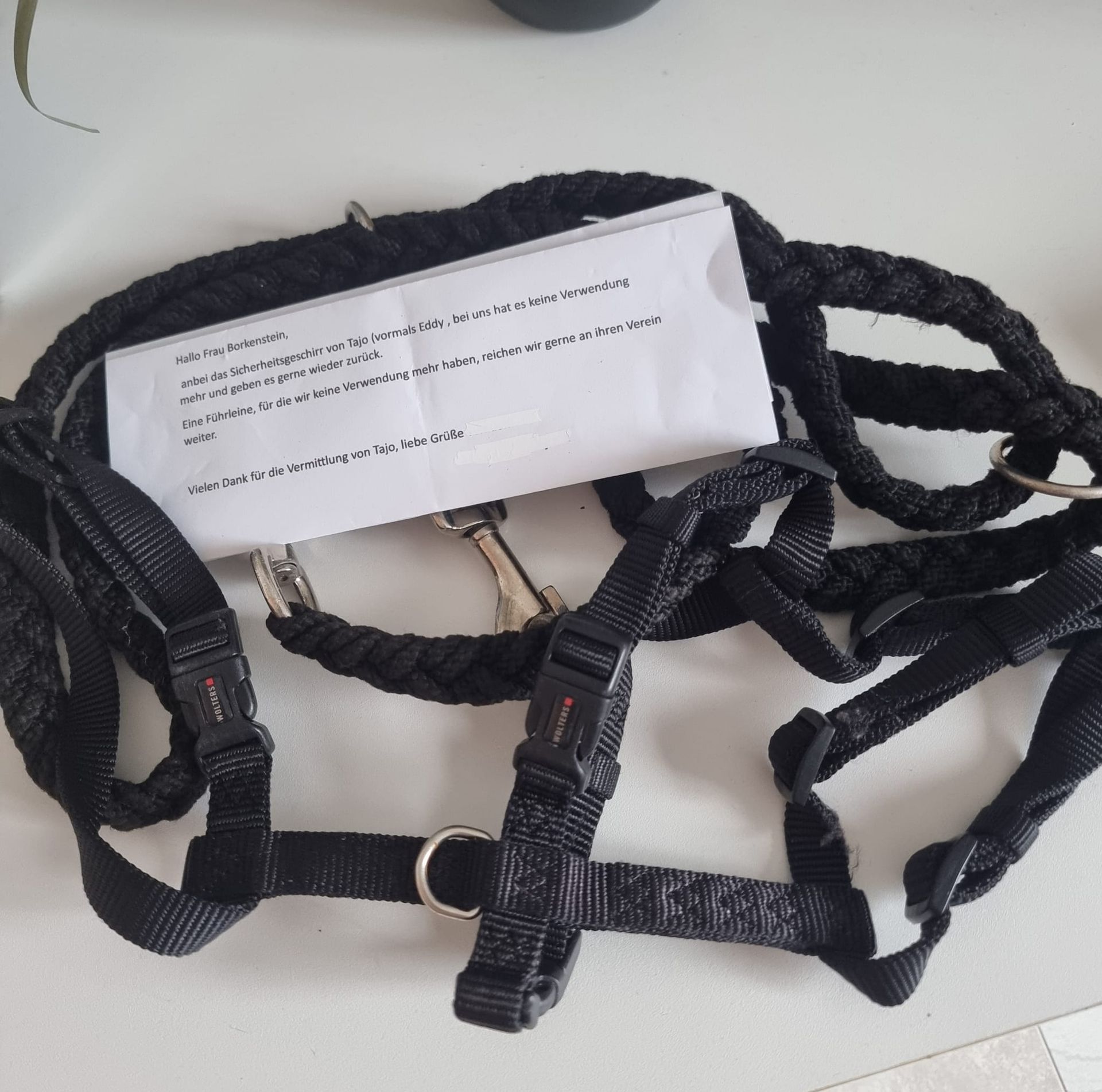 Herzlichen Dank, die Adoptanten unseres Eddy, der nun den Namen Tajo trägt, haben uns freundlicherweise das Sicherheitsgeschirr zurückgeschickt. Eddy ist inzwischen leinenfest, so sicher in allen Situationen, dass dieser Dreipunktgurt nicht mehr nötig ist.