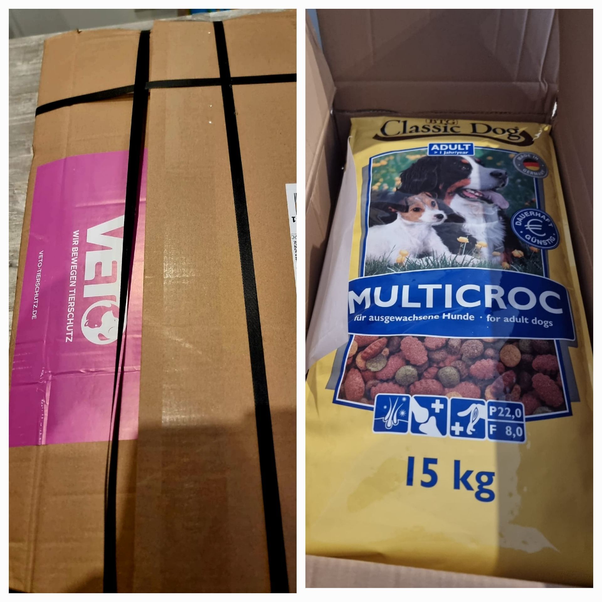 VETO sagen wir mal wieder herzlichen Dank, ein 15 Kilo Sack. Hundefutter ist uns geschickt worden, der mit Sicherheit mit der nächsten Palette sich auf den Weg nach Mirtofito macht. Herzlichen Dank, sagen wir natürlich hierfür ebenso wie auch für die Unterstützung finanziell, denn ganz spontan ist VETO eingesprungen, als der Sturm und Regen bei uns im Winter so viel zerstört haben.