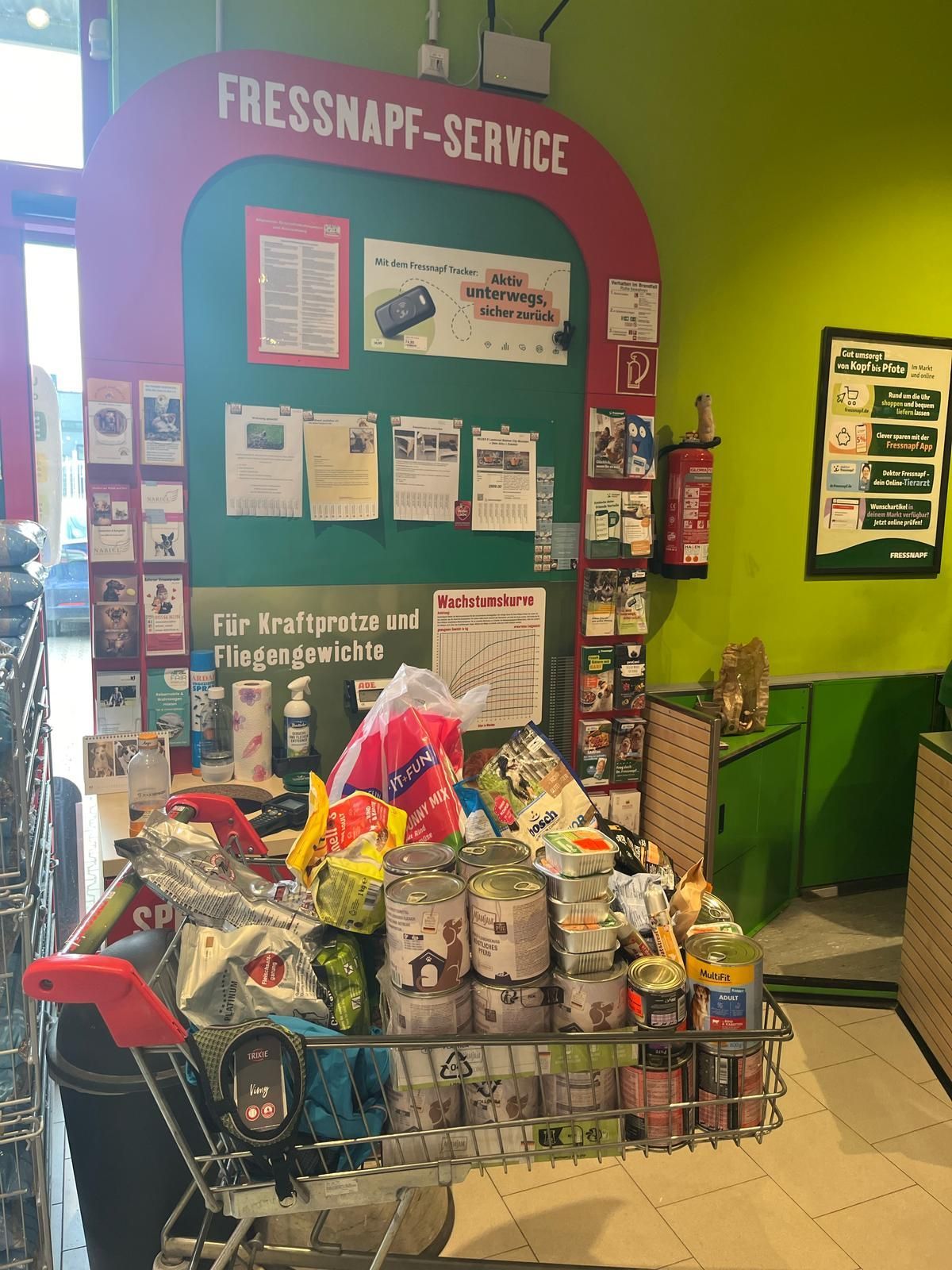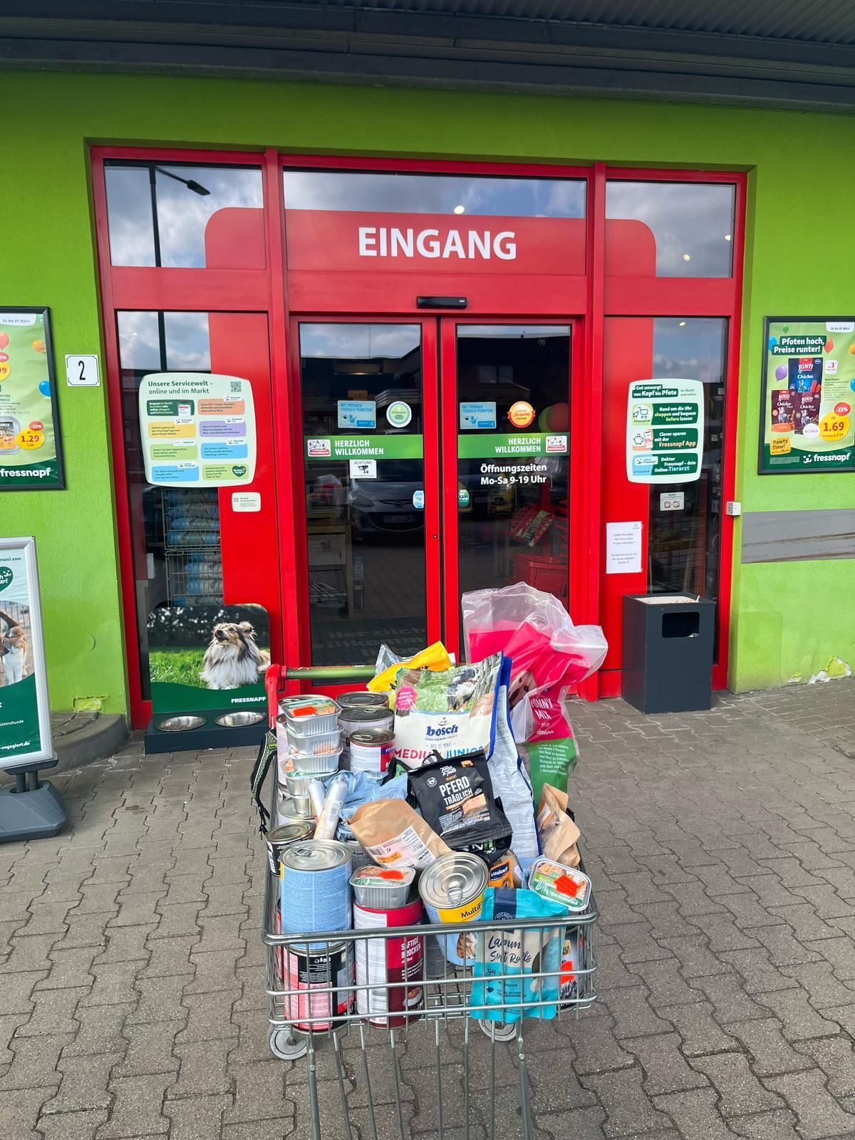 Ein herzliches Dankeschön geht erneut an den Fressnapf in Haltern am See. Sowohl den Tierfreunden des Fressnapfs als auch seinen Kundinnen und Kunden sagen wir danke für einen ganzen Einkaufswagen voll mit Dosenfutter und Trockenfutter, Leckerchen und Spezialnahrung. Diese werden sicherlich schon sehnlichst im Tierheim in Mirtofito erwartet.