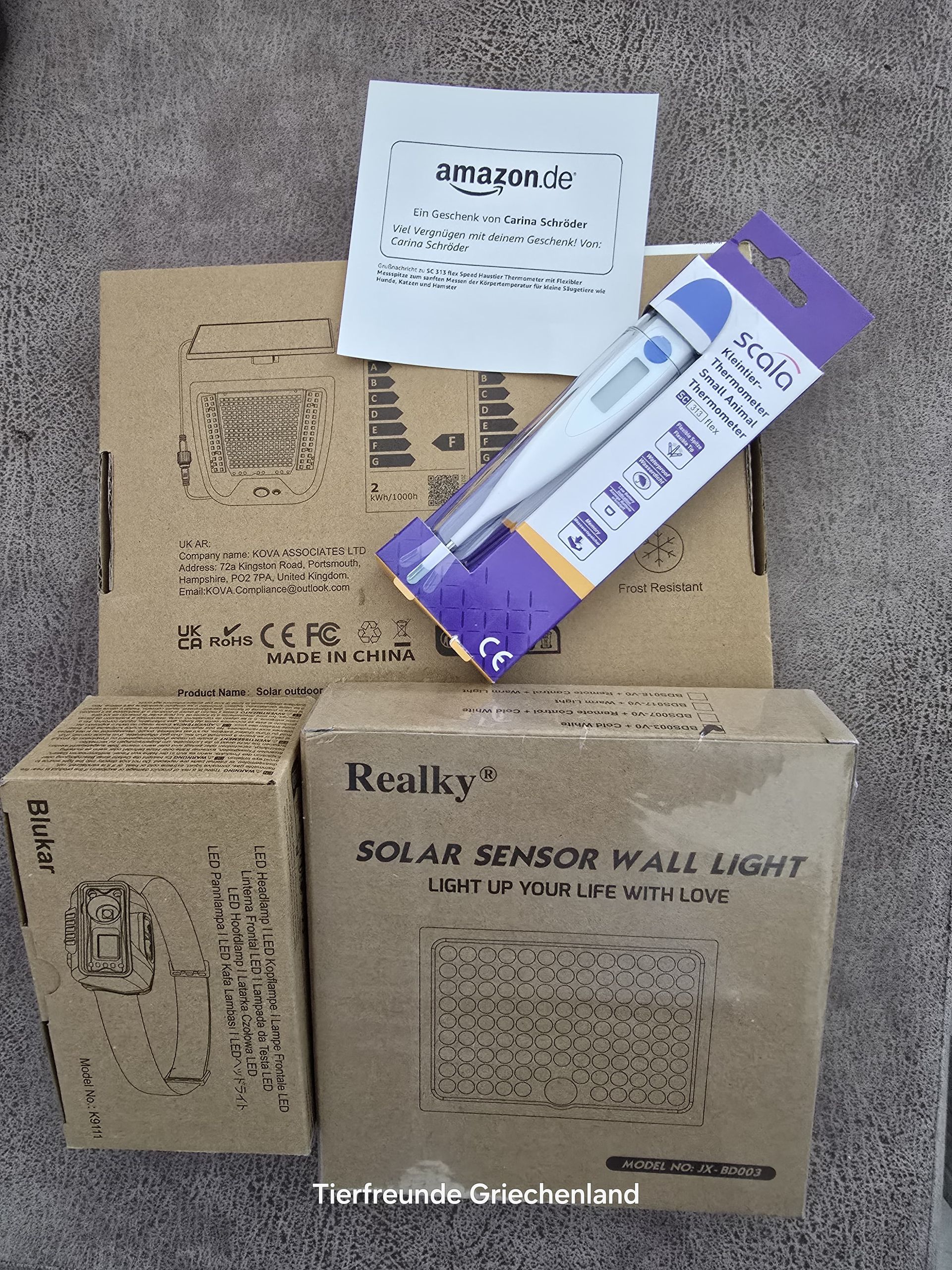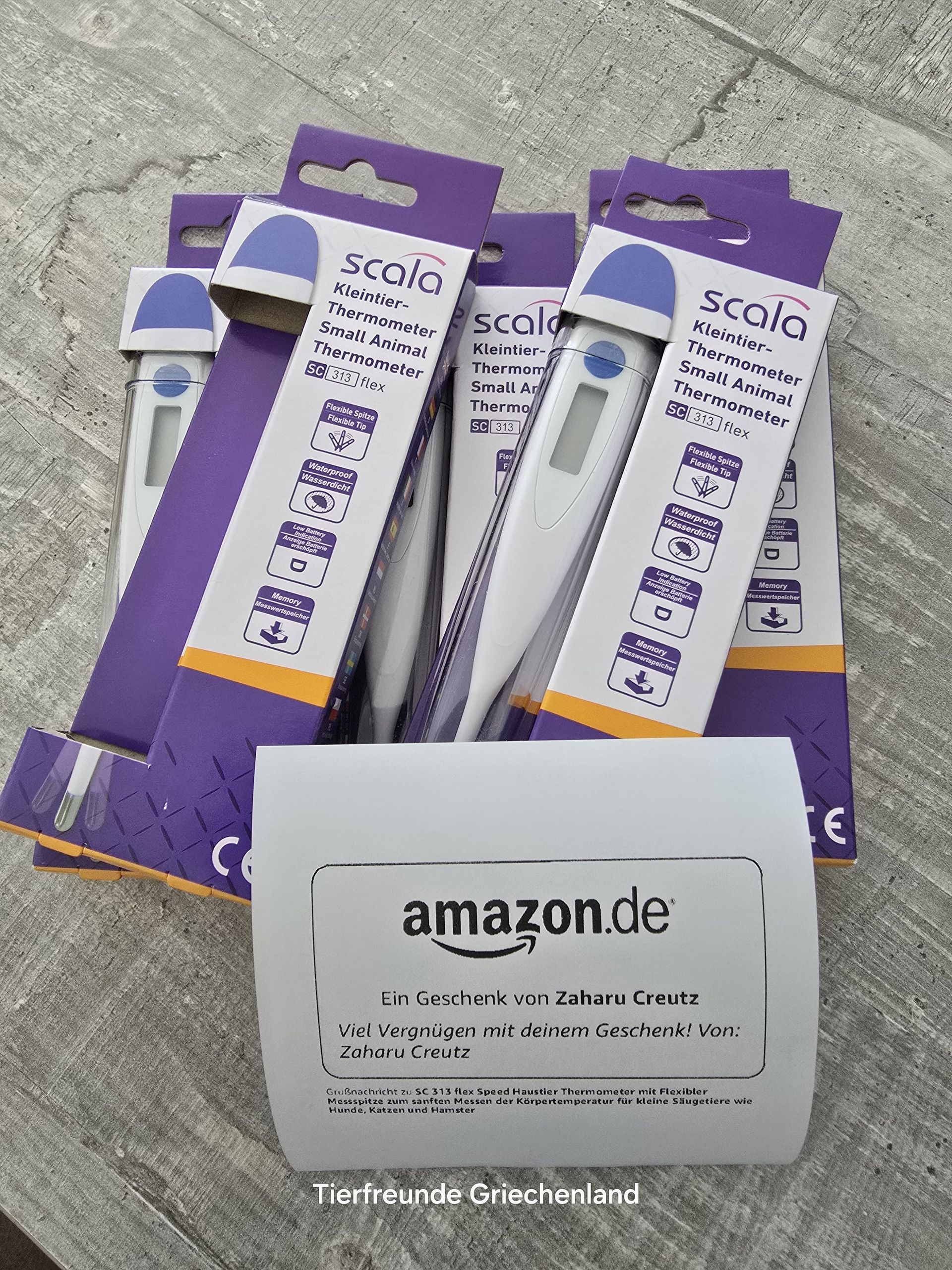 Wir danken ebenfalls Zaharu Creutz, die uns gleich fünf Fieberthermometer 🌡️ von unserer Amazon Wunschliste geschickt hat. Es hilft einfach, wenn wir vor Ort schon direkt prüfen können, ob die Temperatur einer Fellnase erhöht ist, und wir einen Tierarzt-Besuch anschließen lassen müssen. Vielen lieben Dank!