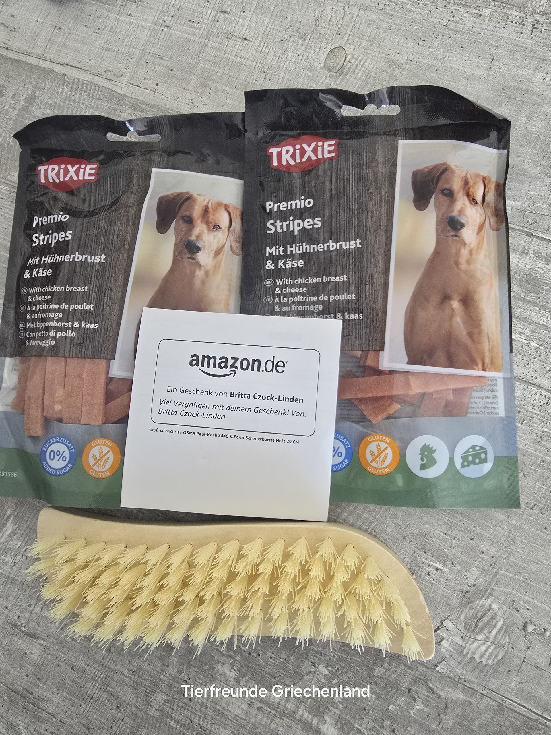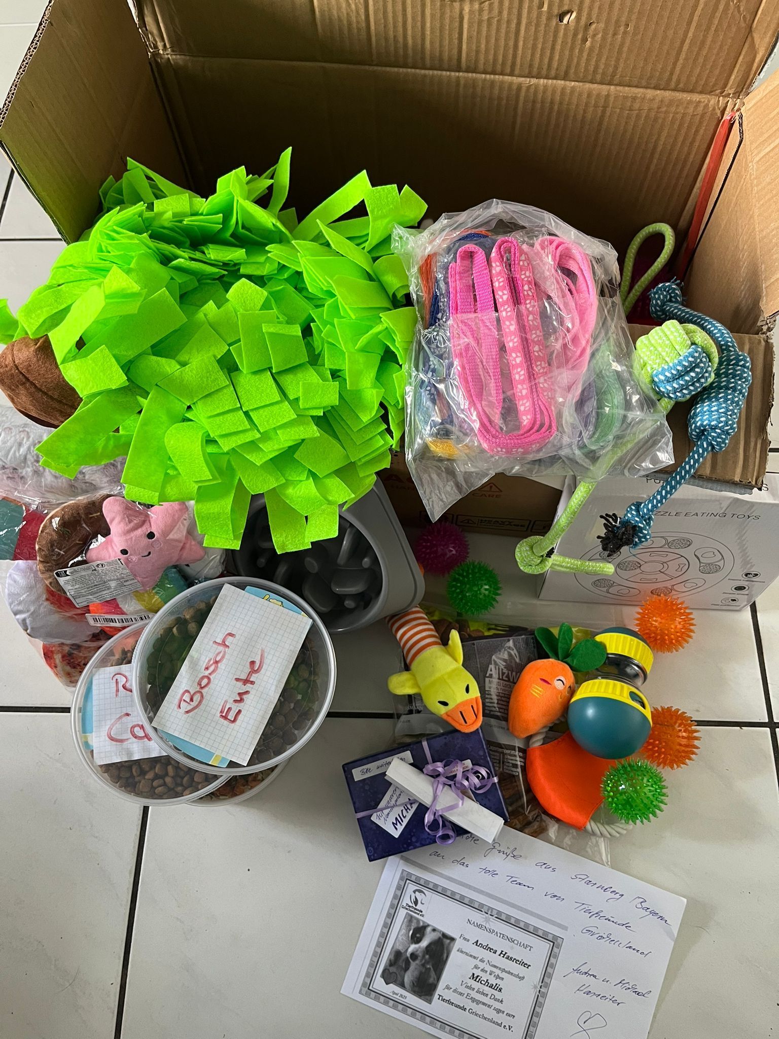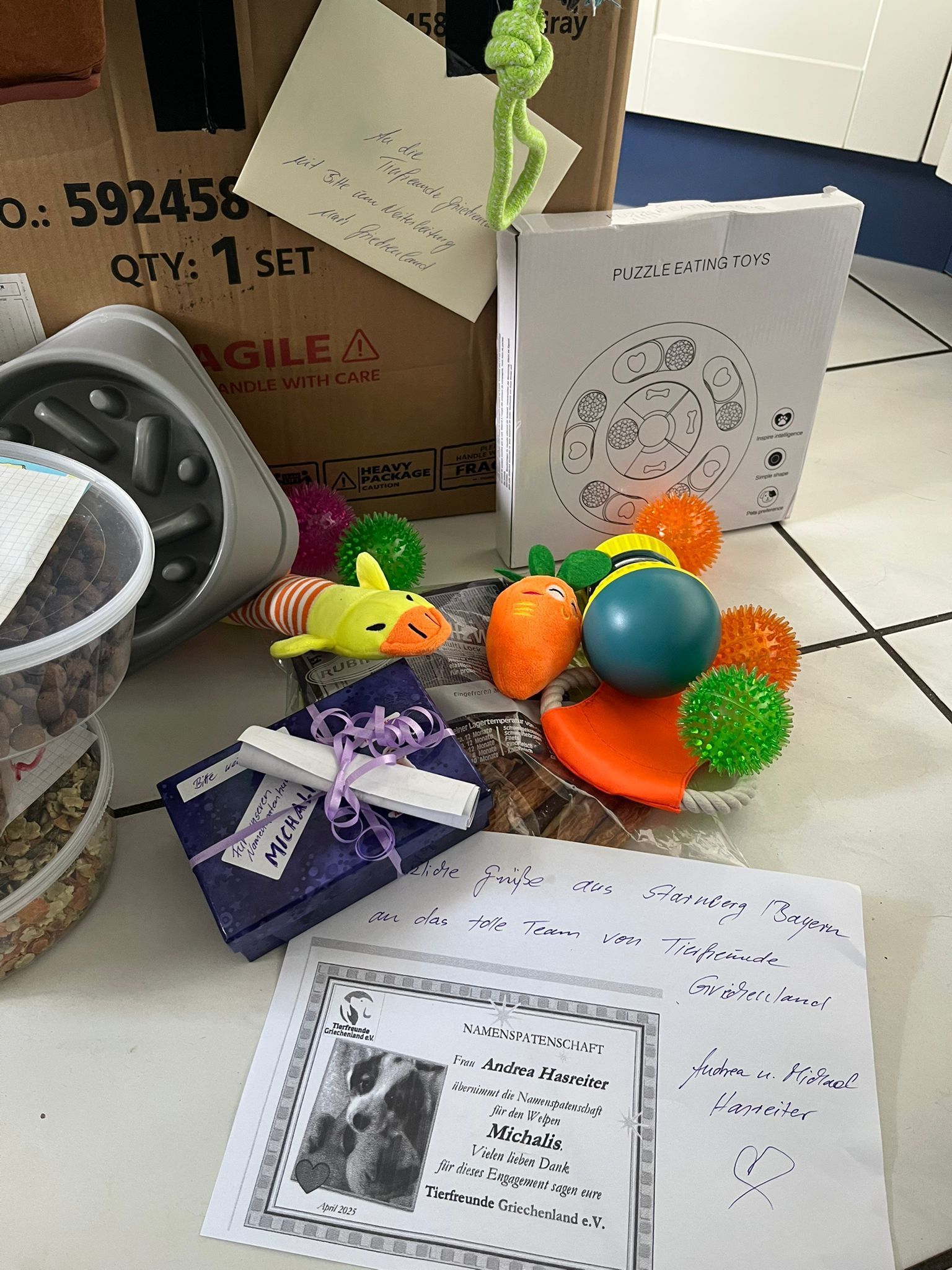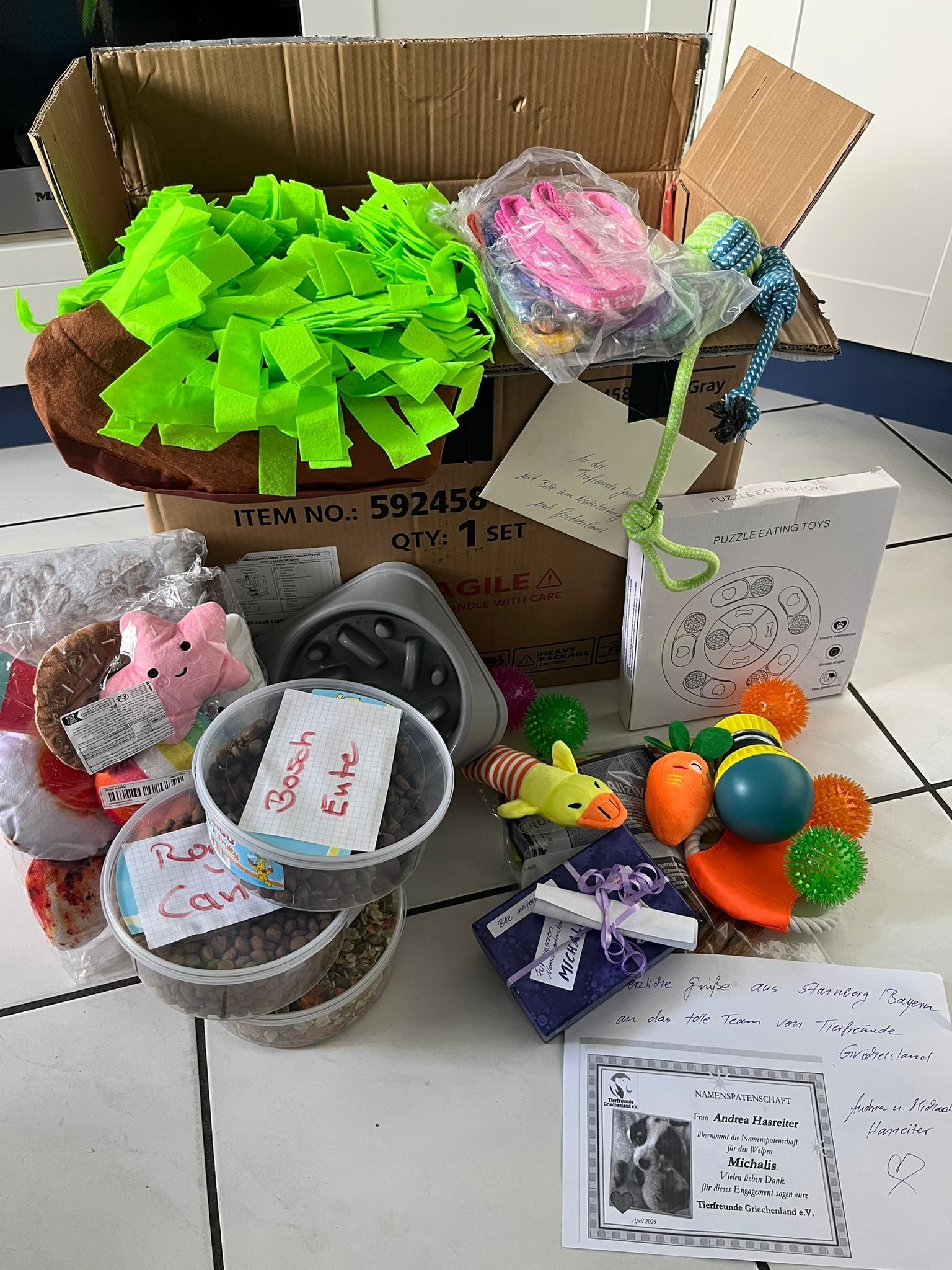 Ein herzliches Dankeschön sagen wir Andrea und Michael Hasreiter für das große Paket mit tollen Spenden für unsere Hunde in Griechenland. Es sind nicht nur herzliche Grüße und ein extra Päckchen für den Patenhund Michalis dabei, auch viele Leckerchen und Spielzeug für die Hund Kumpel im Gehege. Eine tolle Überraschung, wir sagen herzlichen Dank. ☺️😍💙