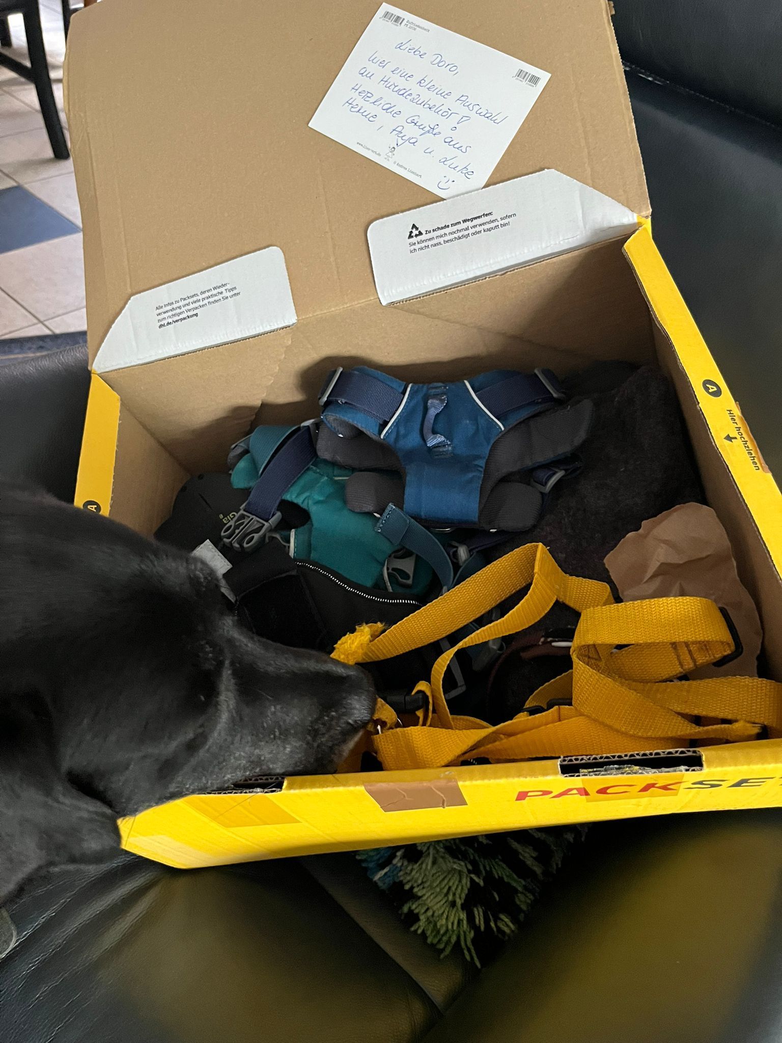 Zudem sagen wir : danke, Andrea, die für uns diesen großen Hundekorb mit ein bisschen Inhalt abgegeben hat! 🙏🏽💙