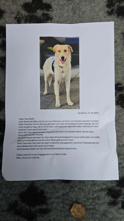Ein herzliches Dankeschön geht an die Adoptionsfamilie von unserer Nike. ❣️Nick und Claudia bedanken sich mit einigen Dosen und Tüten Hundefutter und spenden auch das Sicherheitsgeschirr wieder. Das ist nicht nur nachhaltig, das hilft uns auch gewaltig!