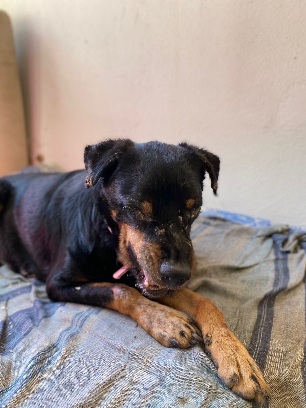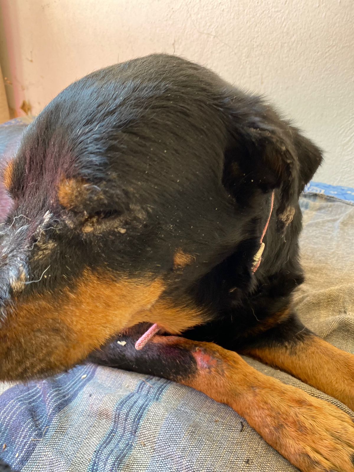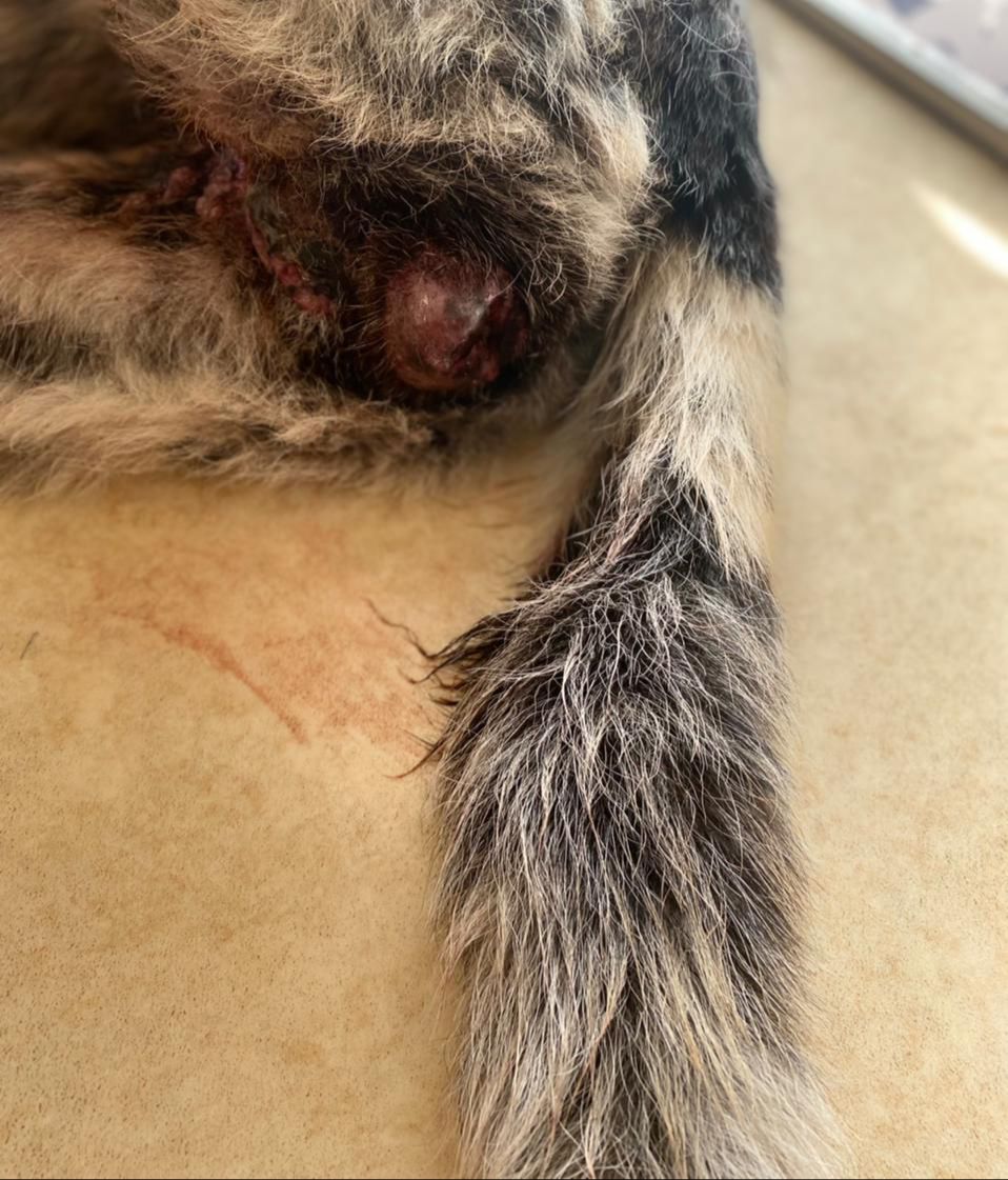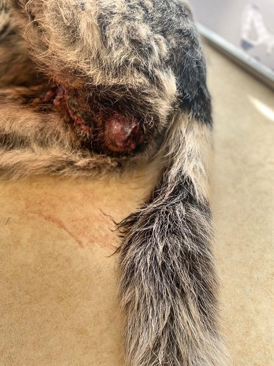 Kilian war angefahren an der Autobahn aufgefunden worden. In der Klinik, wo er drei Tage verbleiben musste, da die offenen Wunden gereinigt werden mussten und sein linkes Bein Sorgen bereitete. Die Lähmungen sind wohl zurückzuführen auf den gebrochenen dritten Lendenwirbel, der niedriger lag als die Wirbelsäule. Dies bedeutet Ruhe halten, eine OP kann folgen müssen. Die offenen Wunden am Hinterleib sowie am Hodensack waren äußerst schmerzhaft, so wird er nun weiter mit Antibiotika und mit Fieber senkenden Mitteln behandelt. Die Kosten belasten unser Budget schon sehr, aber Hilfe hat für uns Vorrang.