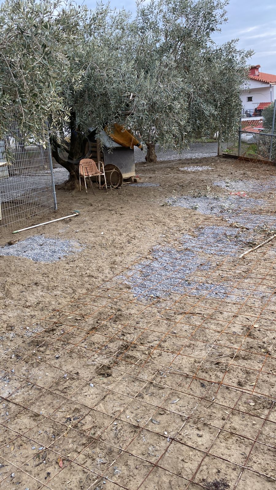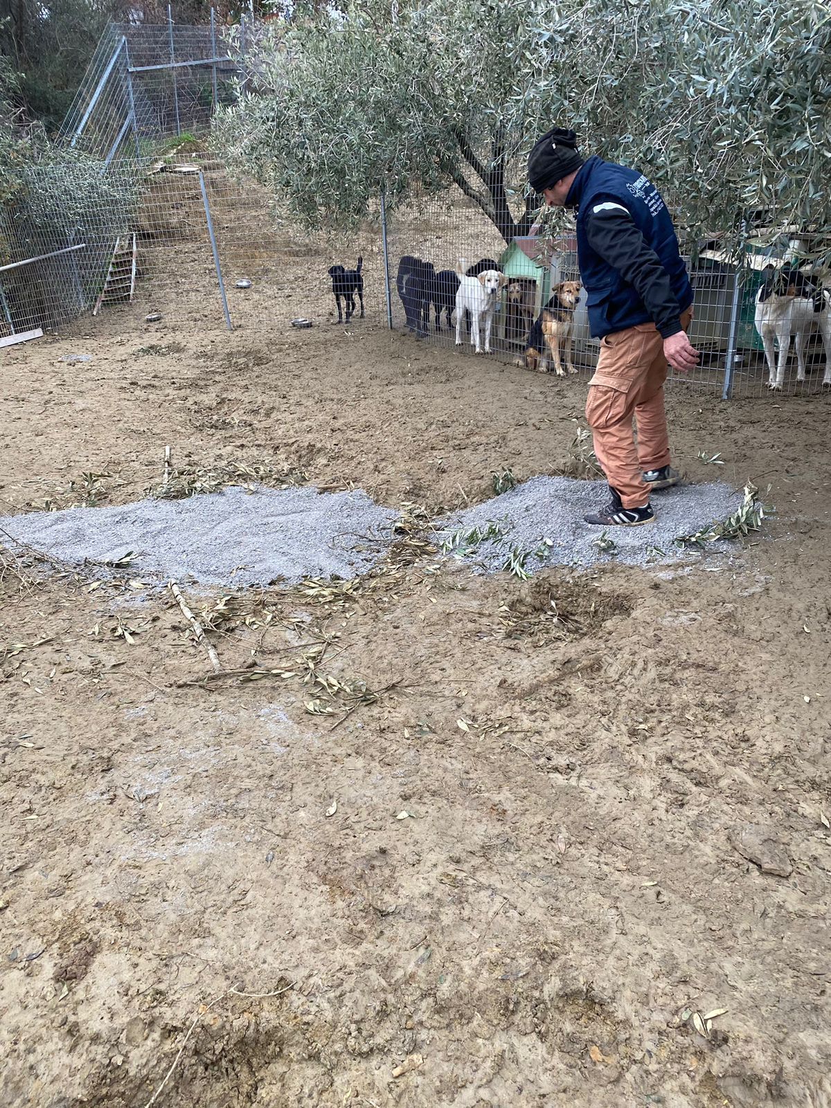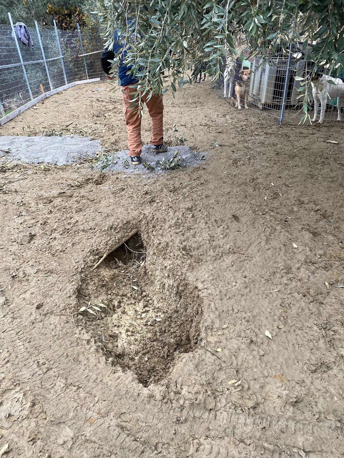 Das neue Gelände für die Hunde nimmt Formen an. Zum einen ist der Kies gekommen, der sowohl auf dem alten Platz die Löcher füllt und so die Hunde trockener bleiben lässt, zum anderen ist so der neue Platz schon mal eingegrenzt worden. Im tieferen Bereich ist das Gelände befestigt worden, wo die Hundehütten geplant sind und heute ist Gott sei Dank doch noch der Betonmischer gekommen. Also, das Gelände ist nun eingezäunt, der Hüttenplatz eingeebnet und betoniert, alles unter dem festen Blick der zukünftigen Bewohner. Deren Kommentare sind ebenfalls nicht zu überhören.