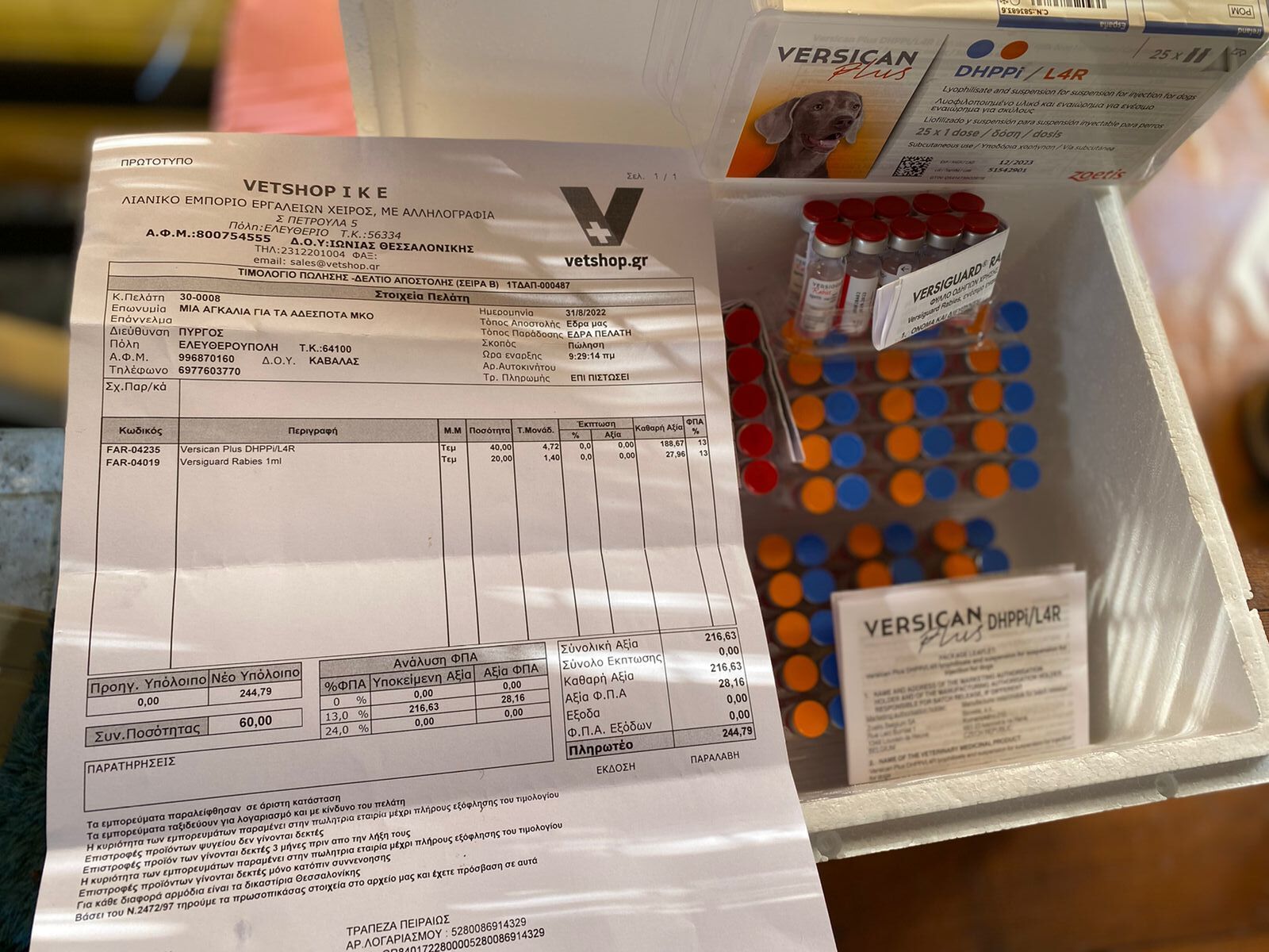 Neben dem normalen recht anspruchsvollen Alltagsgeschäft, alle Hunde zu füttern und zu versorgen, unterstützen wir natürlich Aliki auch bei den medizinischen notwendigen Behandlungen. So sind in der letzten Woche tierärztlich 20 Impfungen durchgeführt worden, einzelne Hunde noch mal reisefähig untersucht worden. Außerdem konnte das Antiparasiticum Advocate® besorgt werden, und Mittel gegen Durchfall für die von der Gemeinde bei Aliki abgegebene Welpen. Ebenso war der Einkauf für Wurmbehandlungen nötig, hier konnte mit 500 Stück für 200 € gut gespart werden. Diese Hilfe ist nur dank Eurer Spenden möglich. Danke und weiter so