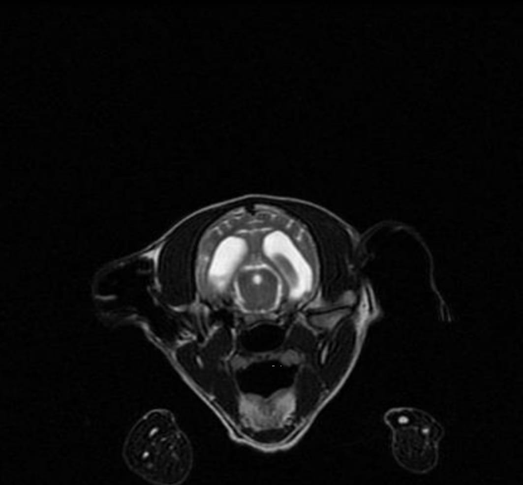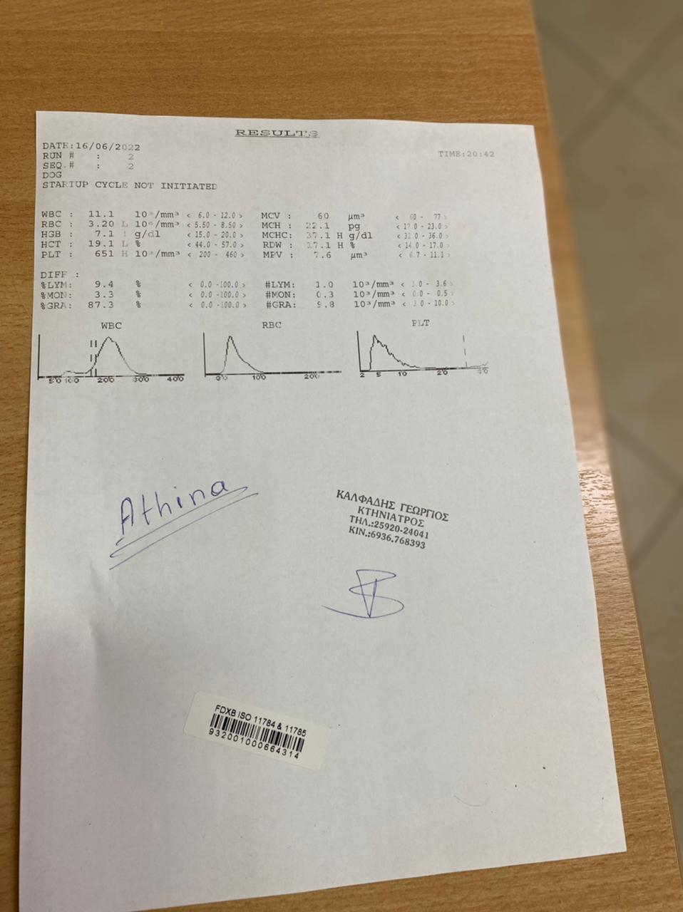 „REPORT" Der Hund namens Nike wurde am 21/09/2022 mit neurologischen Symptomen vorgestellt: Ataxie, Desorientierung, Muskelzittern und unsicherer Gang. Nach der neurologischen Untersuchung wurde eine Erkrankung des Vorderhirns vermutet. Die Blutuntersuchung war innerhalb normaler Grenzen. Die Liquor-Analyse ergab keinen Hinweis auf eine Infektionskrankheit oder eine auf Steroide ansprechende Meningoenzephalitis. Es wird ein MRT des Gehirns und eine neurologische Untersuchung durch einen Facharzt für Neurologie empfohlen, um eine angeborene Hirnerkrankung zu bestätigen und die Prognose zu bestätigen. Die Untersuchungen von Nike sind beigefügt (s.Bilder)“