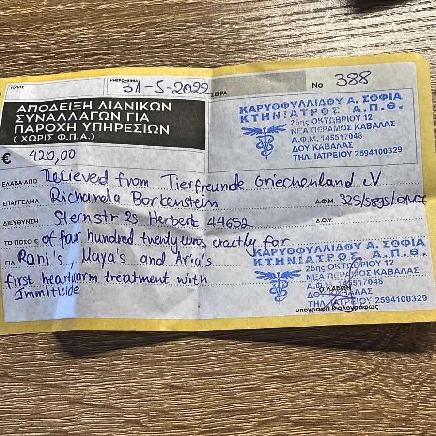 Dank der Spenden konnten wir sowohl ausreichend Spot-Ons als auch Impfstoff erwerben. Auf den Videos kann man gut sehen, wie Aliki die Hunde gegen Mücken, Stechfliegen und Zecken wappnet, die Impfungen unternimmt der Tierarzt, sodass wir Ihre neuen Fellnasen gesund nach Deutschland bringen können und unsere Patenhunde, die in Griechenland bleiben, ebenfalls gut versorgt sind und dich wohl fühlen.