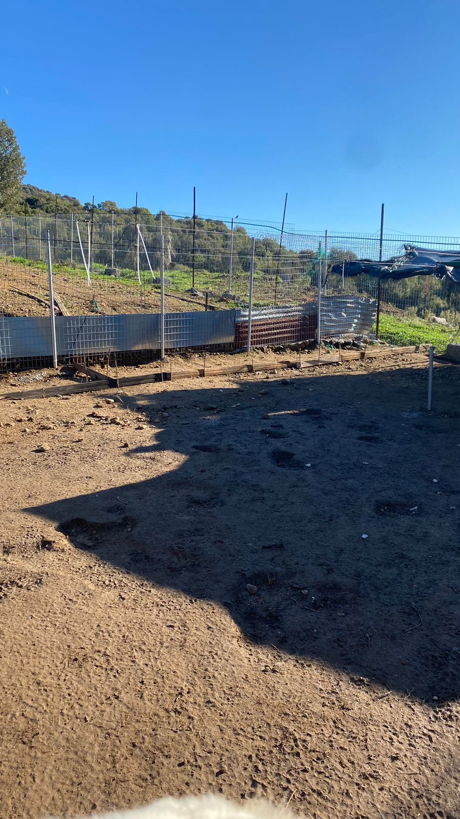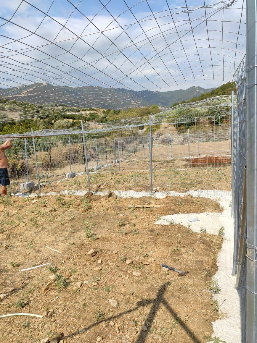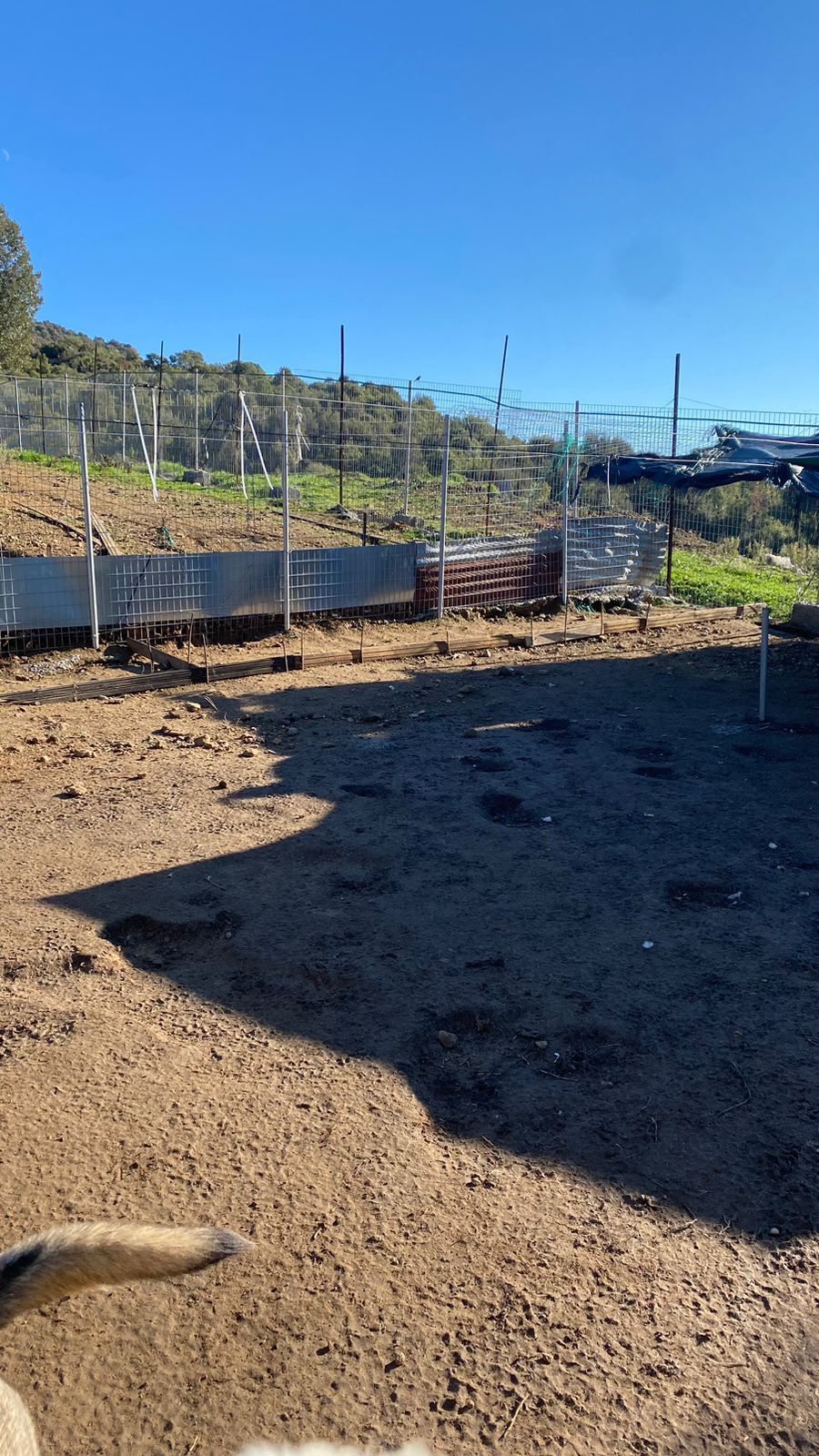 Wir, also unsere Tierschützer in Griechenland, zusammen mit Freunden, haben natürlich zuerst das ganze Gelände eingezäunt, dafür haben sie / wir das ganze Material gekauft, und zwar nicht nur den Zaun, Metallstäbe, Schrauben, Streben, Verlinkungen, Gelenke …