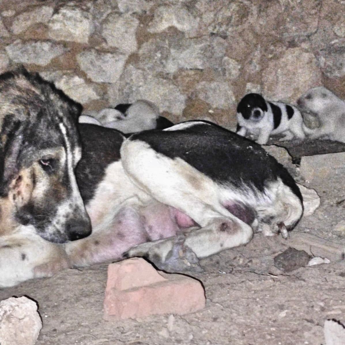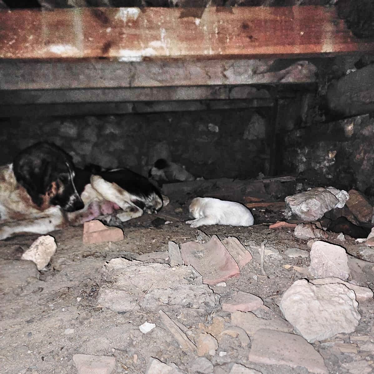 An den Thermen lebt Kómissa und hat Nachwuchs bekommen. Diesen schützt sie vor den anderen Hunden dadurch, dass sie in dieser Höhle eines Hauses gut eingemauert und versteckt ihre kleinen Welpen mit Muttermilch versorgt. Villi, die die Hunde dort füttert, versucht an die Mutter und ihren Nachwuchs heranzukommen, allerdings ist die Mutter sehr, sehr vorsichtig, schon allein, damit die anderen Hunde sie nicht angreifen oder womöglich ihren Nachwuchs durch Bisse töten. Diese Vorsicht hindert uns aber daran, die Welpen zu sichern, mit viel Geduld werden wir diese Gruppe beobachten und zu füttern versuchen. 💙🥰