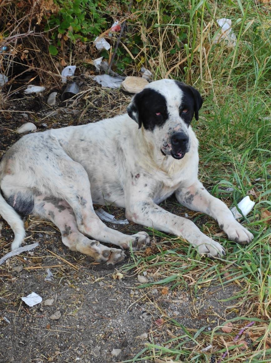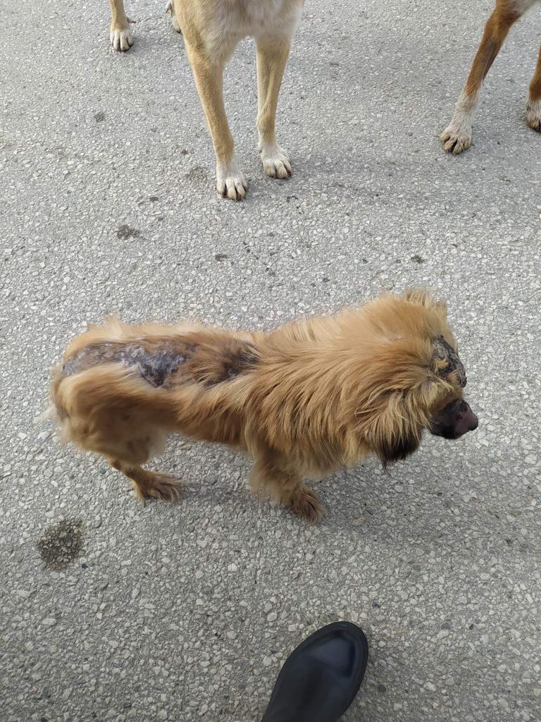 Dieser arme Kerl konnte endlich von der Straße weg geholt werden. Warum er an einigen Stellen kein Fell mehr hat, wissen wir noch nicht. Sind dies vielleicht Folgen eines Brandes, weil jemand einen brennenden Holzscheid auf ihn geworfen hat, um ihn zu vertreiben, oder hat er noch Folgen von einem Autounfall, oder hat er sich mit Krätze infiziert, wir wissen es nicht. Keiner will ihm helfen außer unser Schutzengel Aliki. Also werden wir ihn untersuchen lassen und entsprechend behandeln und hoffen, dass der Fellausfall nur vorübergehend ist. Er ist nun bei Aliki und somit nicht mehr in Lebensgefahr. Das Leben an der Straße ist viel zu gefährlich. Er ist ein ganz zutraulicher Hund, der unsere Liebe braucht. Schaut mal, wie hungrig er ist, wie traurig seine Augen schauen, lasst uns gemeinsam dort wieder Glanz hineinbringen.