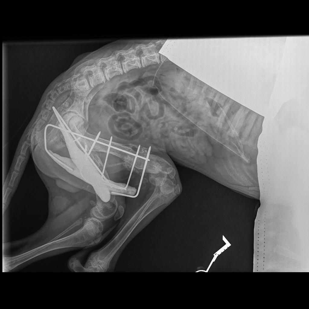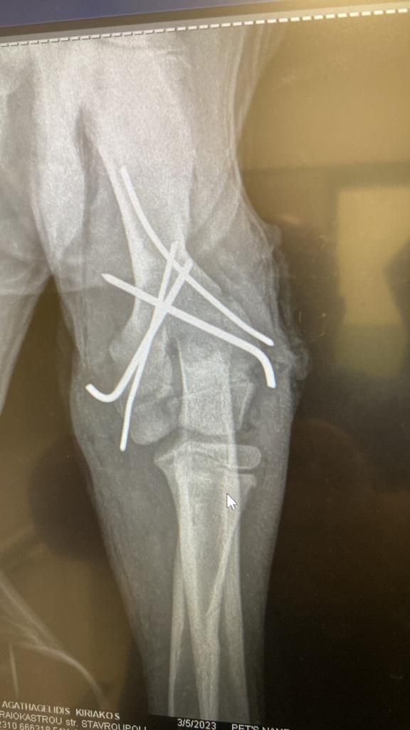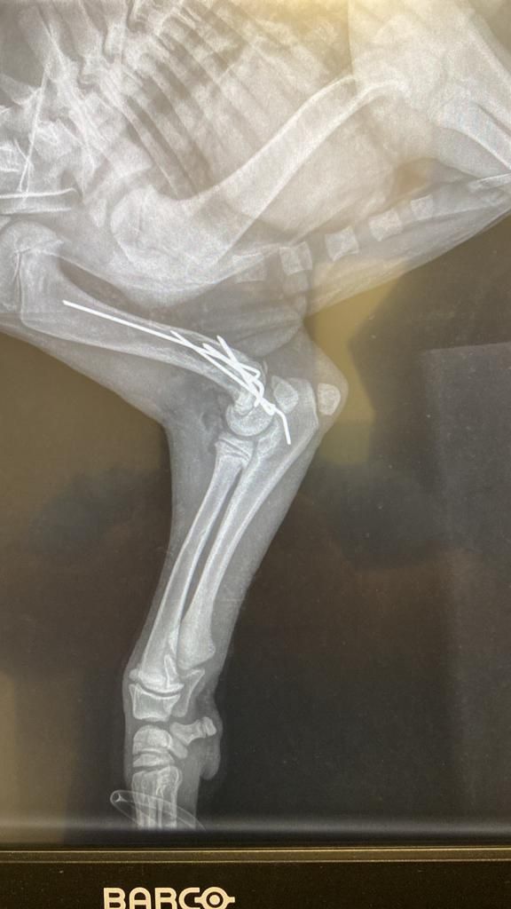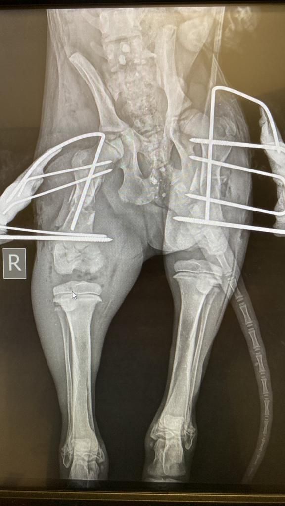 Die Röntgenaufnahmen sind gemacht, und leider hat sich das Schlimmste bewahrheitet. Der kleine Welpe hat bestätigt mehrere Knochenbrüche, Trümmerbrüche, vor allem die Fermurschaftfraktur (Oberschenkel) beidseitig muss umgehend operiert werden, auch das gebrochene Beingelenk muss gemacht werden. Die Klinik hat sich – Gott sei Dank – auf eine Ratenzahlung eingelassen, sonst hätten wir dem Welpen nicht helfen können. So heißt es nun ❗️bitte bitte bitte❗️unterstützt uns beim Spendensammeln. ‼️