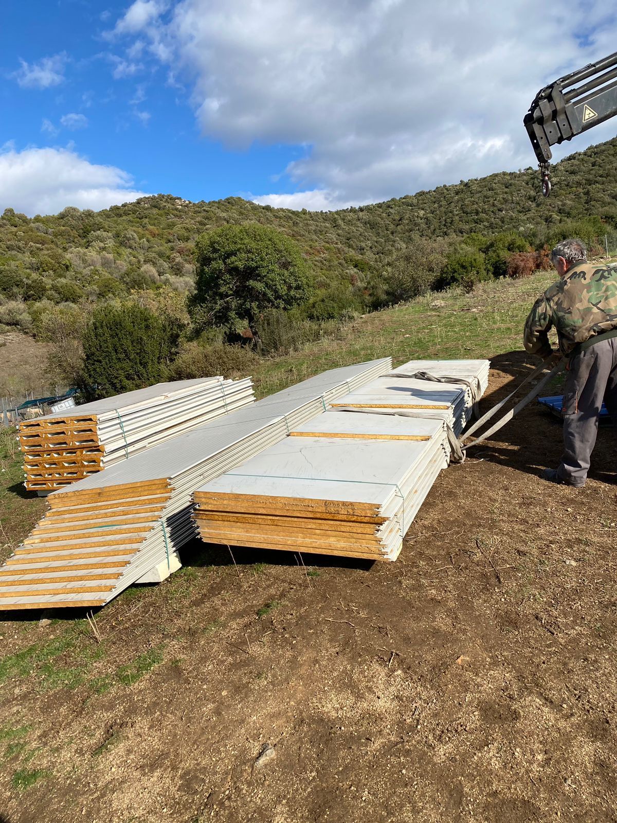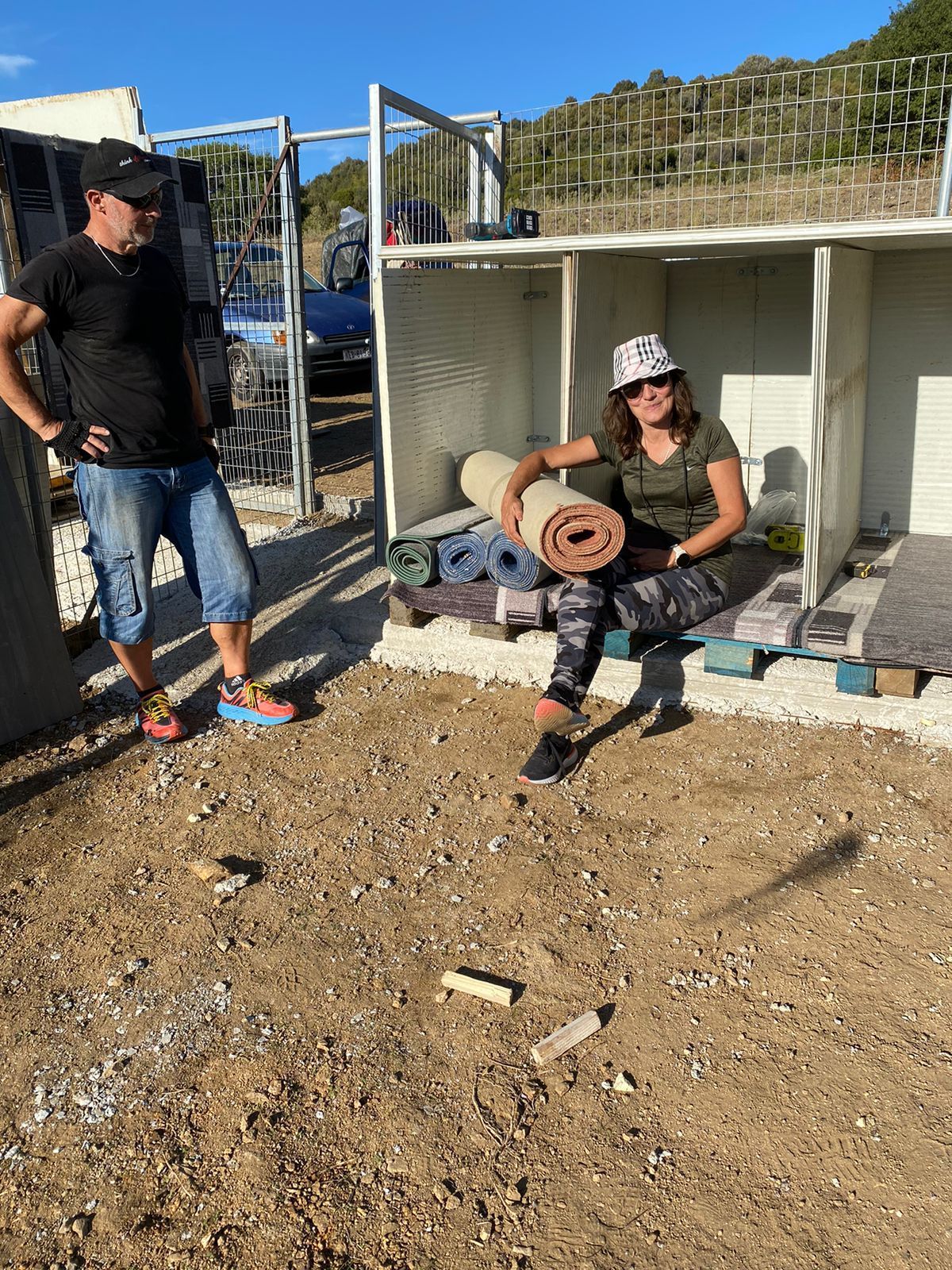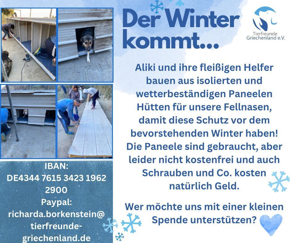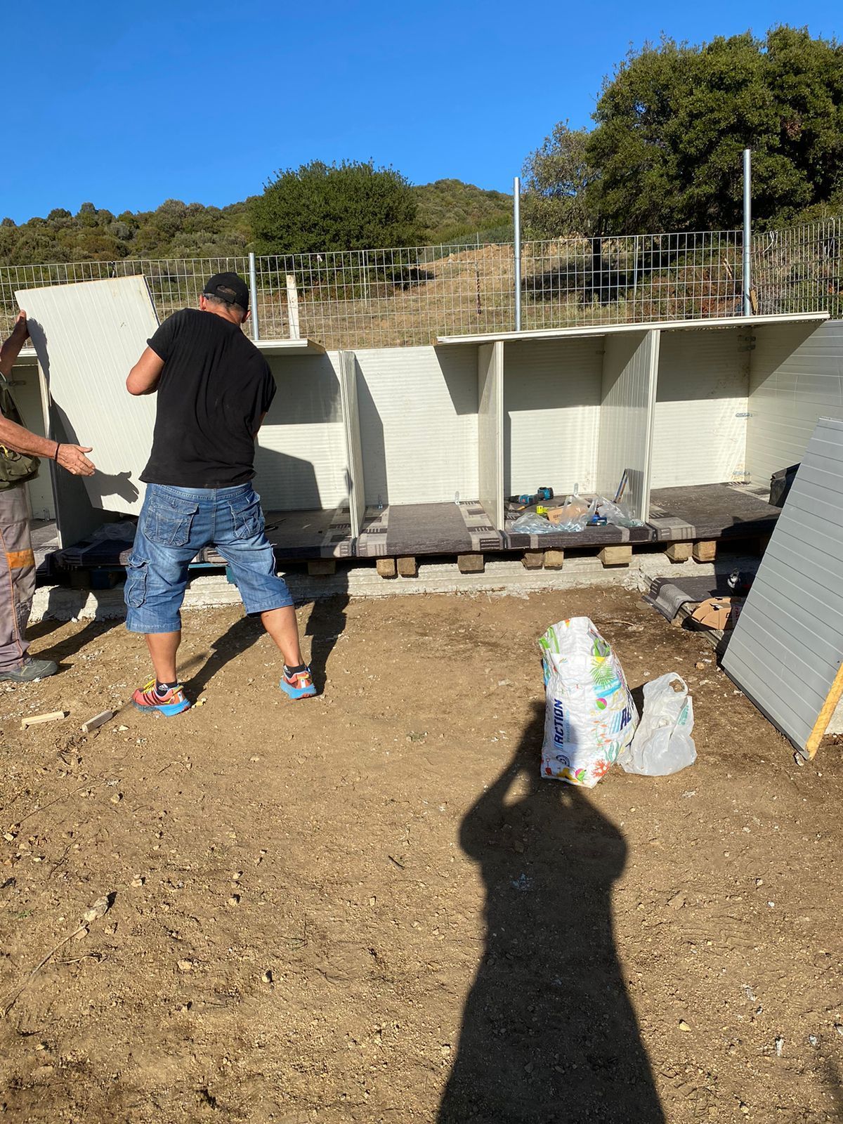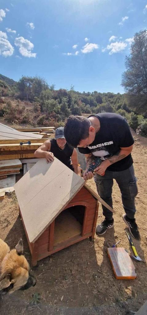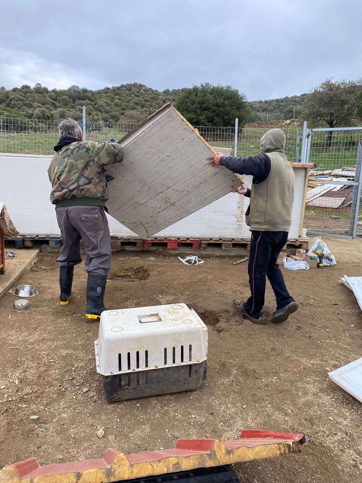 Hurra, es kann weitergehen! Für die nächsten sechs Gehege können die Hundehütten gebaut werden, das Material ist angekommen. Die Arbeiter haben die Vorarbeiten bereits geleistet, der Boden ist geebnet, eine Betonplatte gegossen, und jetzt wird gesägt, gebohrt und geschraubt, was das Zeug hält. So entsteht ganz schnell Stück für Stück eine Vierer- oder Sechserhütte, die unseren Fellnasen Schutz vor Wind und Regen bietet, die ein wenig vor der griechischen Kälte schützt. Dankbar sind wir für die Spenden, die uns den Kauf dieses Materials ermöglicht haben. Wir sammeln unermüdlich weiter, denn schließlich wollen wir in jedem Gehege und für jede Fellnase ein geschütztes Plätzchen schaffen! Trotz der zwei oder drei freiwilligen Helfer vor Ort brauchen wir noch Arbeiter, die für einen entsprechenden Lohn hier helfen. Also, es geht voran! 🥰💙