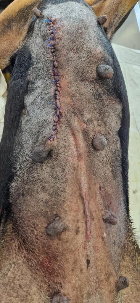 Wir hatten berichtet: Unsere Felice ist inzwischen operiert worden. Der große Tumor am Bauch, der sicher auch beim Laufen, erst recht beim Säugen störte, konnte dank der Spenden für diesen Jagdhundmix entfernt werden 🍀
