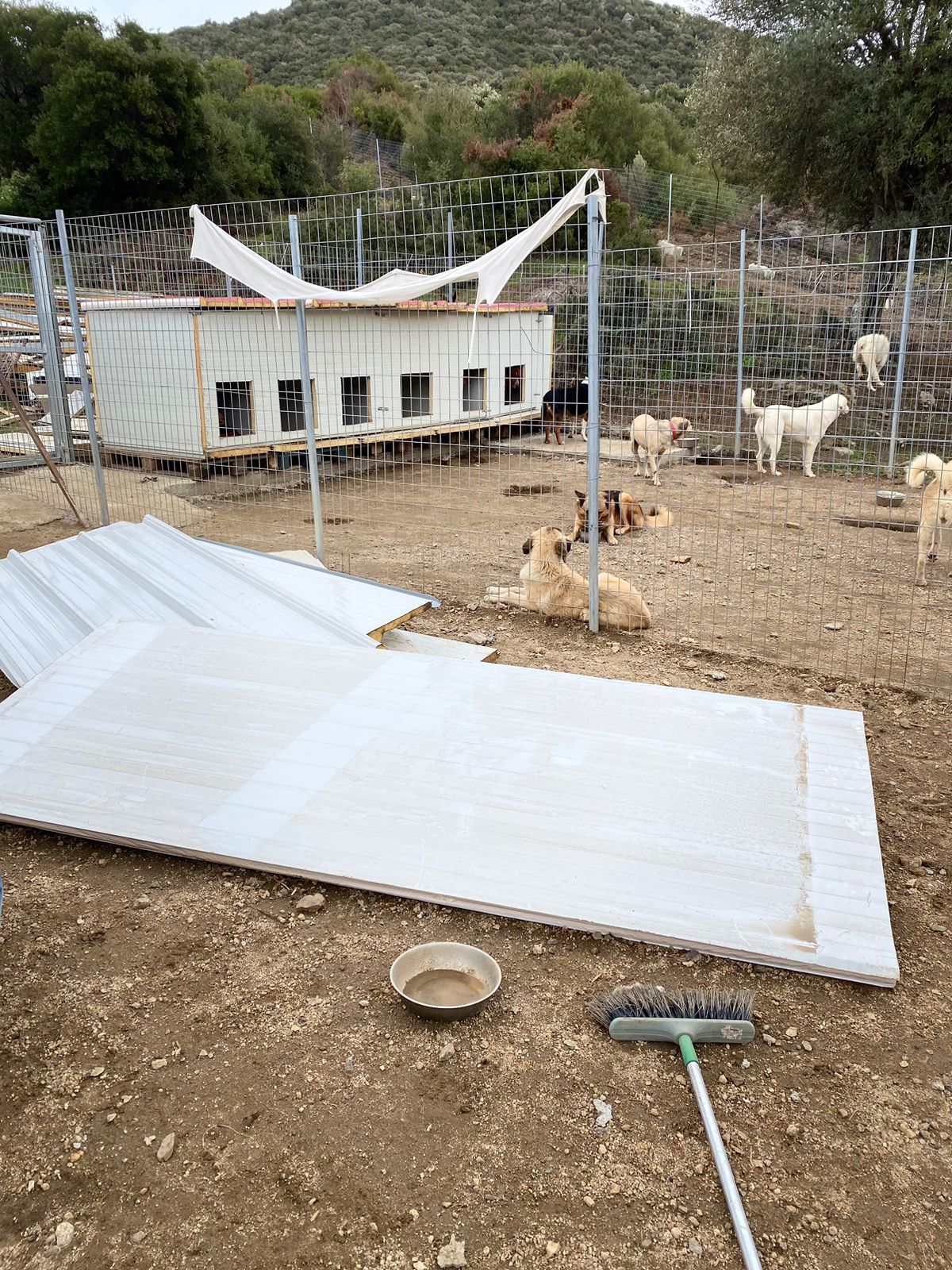 Leider! Auch wenn schon in sechs Gehegen die Hundehütten stehen, so fehlen noch für weitere Gehege die Hundehütten. Und es ist Winter, es wird immer kälter, die Hunde brauchen dringend einen Unterschlupf! Also hat Aliki nun angefangen, das erste weitere dringend benötigte Material zu bestellen. Natürlich musste erst der Boden vorbereitet und muss nun mit Beton ausgegossen werden, die Hütten dürfen verständlicherweise weder von unten nass werden, noch darf auch bei kräftigen Regen Wasser in die Hütten eindringen. Also hat Aliki bereits die Metalldächer und Schutzbleche bestellt, damit auch bei kräftigem Regen dieser ablaufen kann, in Rohre geleitet, die im Zement so verankert werden, dass sie stabil funktionieren. Auch hat sie weiteres Material bestellt, Maschendraht, um für die Welpen abgetrennte Bereiche bauen zu können.