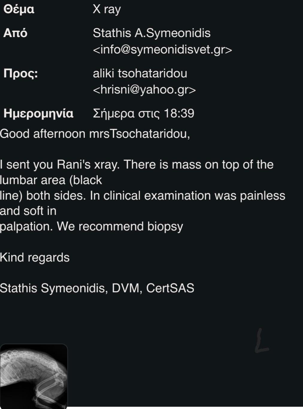 Wir haben Rani zum Arzt gebracht und untersuchen lassen, mit einer Röntgenaufnahme, weil Rani auf dem Rücken Verhärtungen hatte, die nicht einfach Kalkdrüsen oder Fettknubbel sein konnten. Leider zeigt das Röntgenbild, dass auf den Lendenwirbel ein dunkler Schatten beidseitig zu sehen ist, was auf einen Tumor hinweisen könnte. Es ist aber auch beim Abtasten wohl schmerzfrei, und vom Arzt als weich eingeschätzt, er empfiehlt allerdings eine Biopsie zur Absicherung.