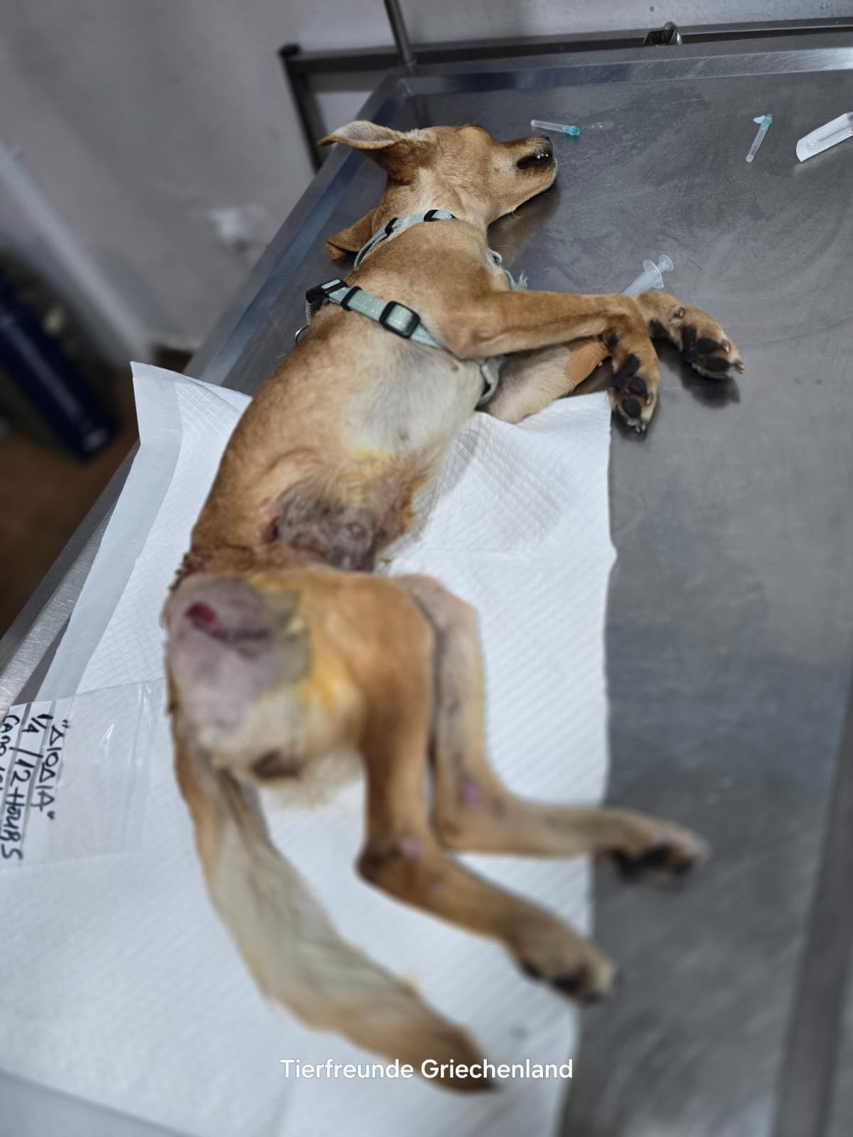 Heute steht die Operation unserer Hündin Angel ๐ an. Wir berichteten, dass sie an einer Mautstation vor Schmerzen schreiend unter einem Auto gefunden wurde, sicherlich angefahren an der Schnellstraße. Angel wird heute zusammen von unserem Tierarzt Manthos und einer Tierärztin operiert, die Spezialistin für diese Hüftoperation ist, dafür aus Thessaloniki angereist ist. Es wird der gebrochene Teil vom Fermurkopf entfernt. Nach der Operation muss Angel sofort laufen, laufen, laufen, damit die Muskeln die Arbeit übernehmen. Ideal wären natürlich Termine bei einem Physiotherapeuten, aber das ist vor Ort für uns nicht machbar. Die Operationskosten werden bei um die 500 € liegen, hier können wir jede Hilfe gebrauchen.